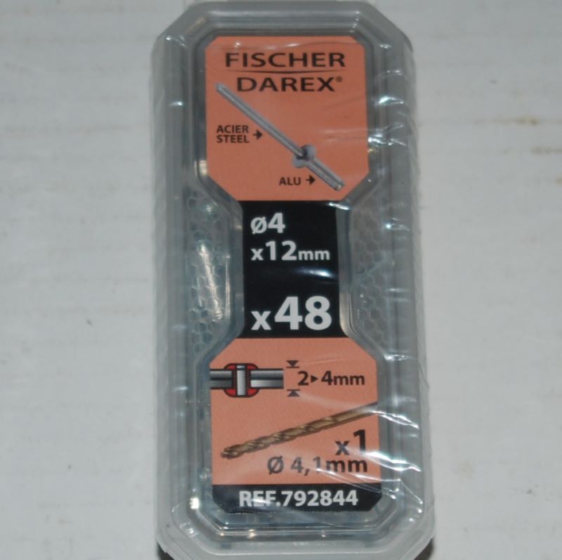 1 boite de 48 rivets aveugles 4mm x 12mm Alu avec 1 foret FISCHER DAREX. Eclaté, tête plate. . . . . . . .