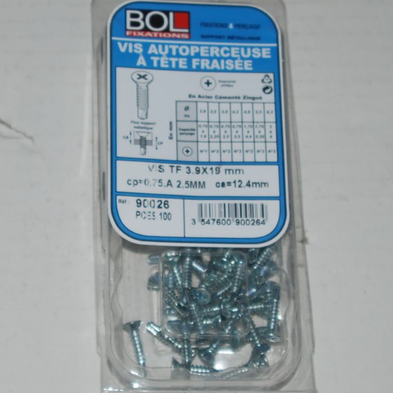 100 Vis Autoperceuse à tête fraisée en Acier Cémenté Zingué Tf 3,8 x 18 BOL-FIXATION ref. 90026. Pour support métallique.