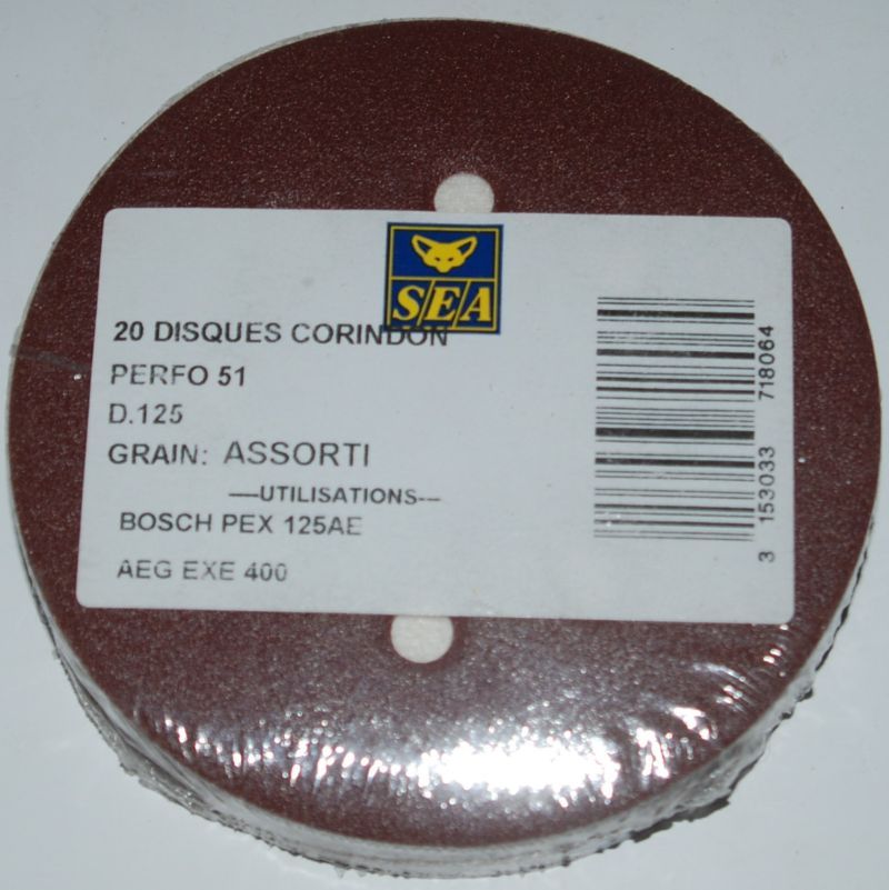 206 Disques auto-agrippant perforé 8 trous D.125 grain 60-80-120 SEA. Corindon. Pour Bois et Métal. . . . . . . . . . . .