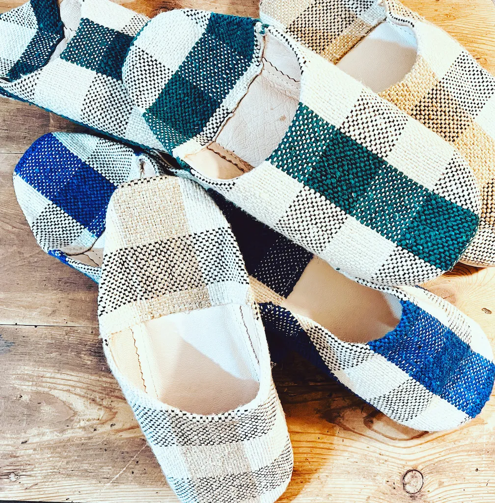 Découvrez nos jolies paires de Babouches-Charentaises Gris Souris en cuir marocain souples et en toile de coton entièrement tissée et cousues à la main par nos artisans marocains.