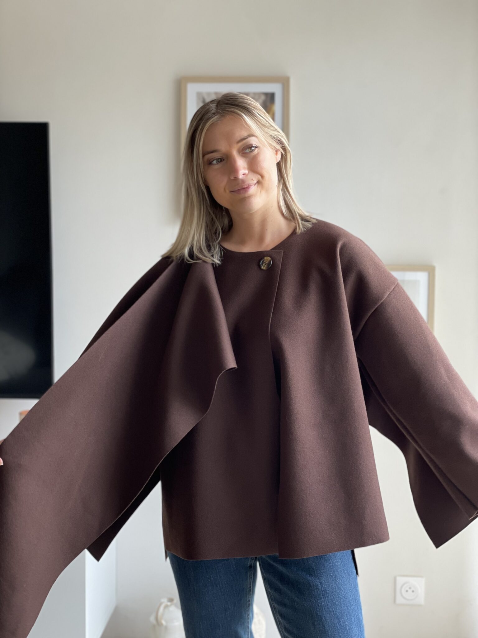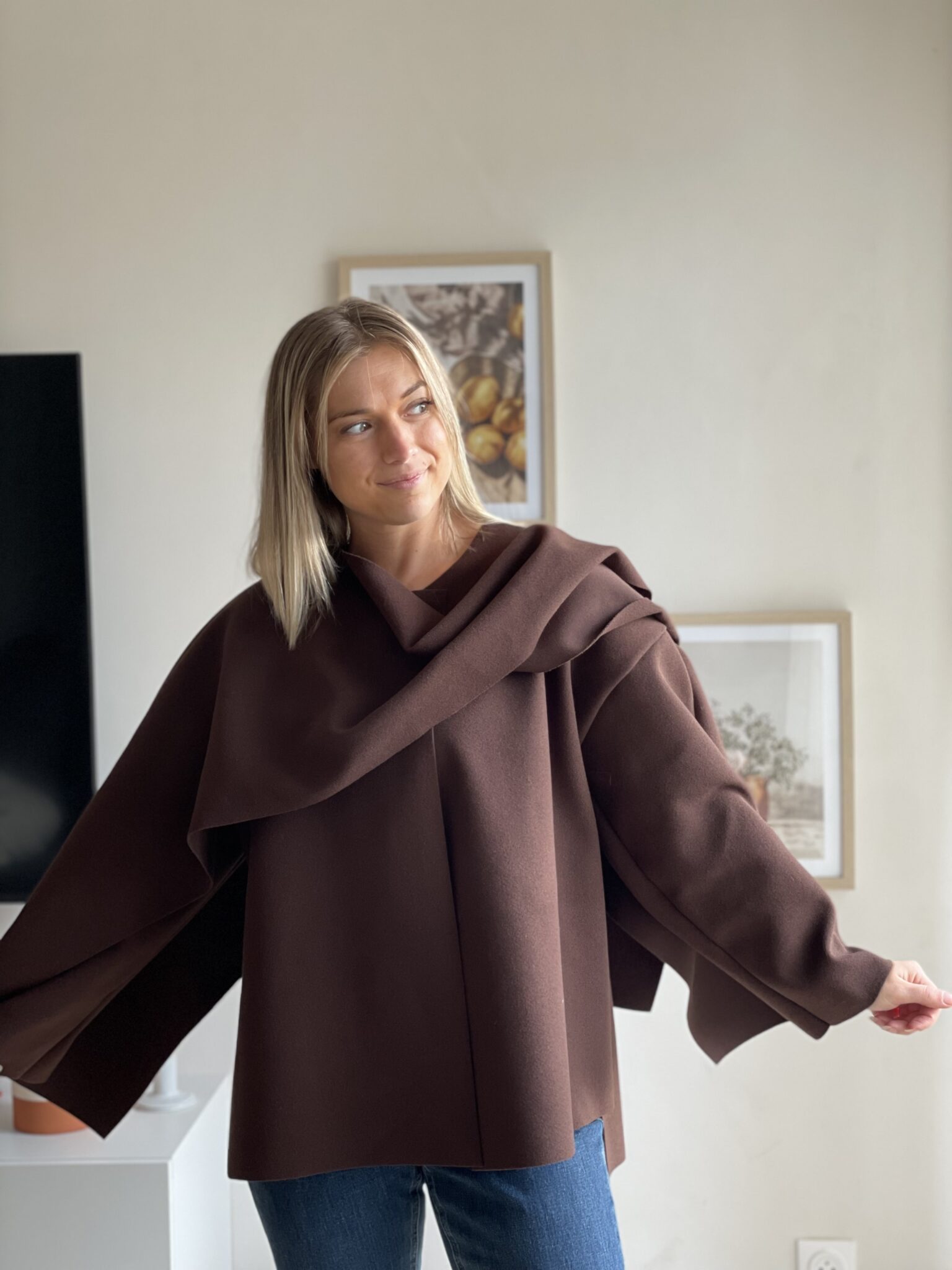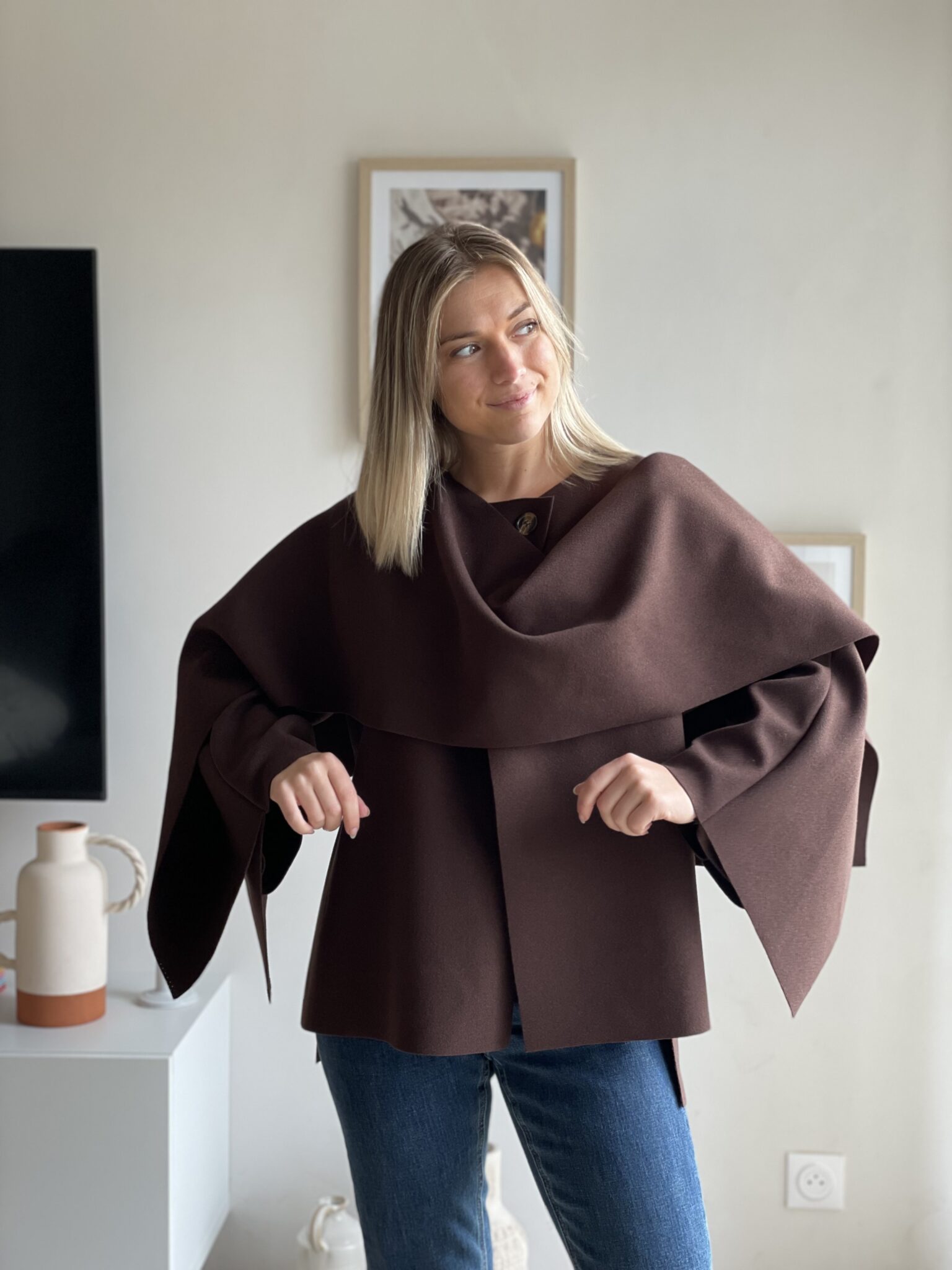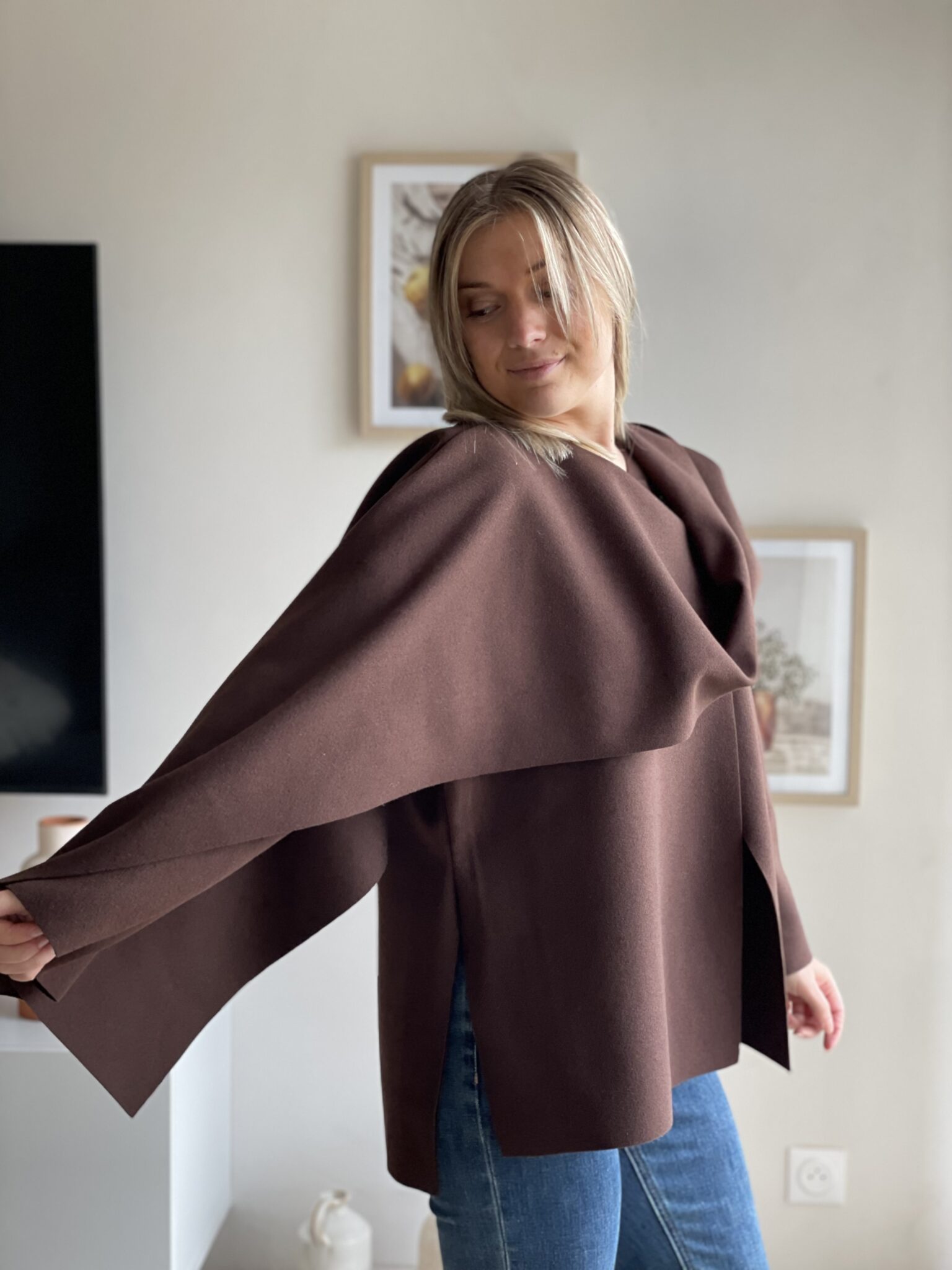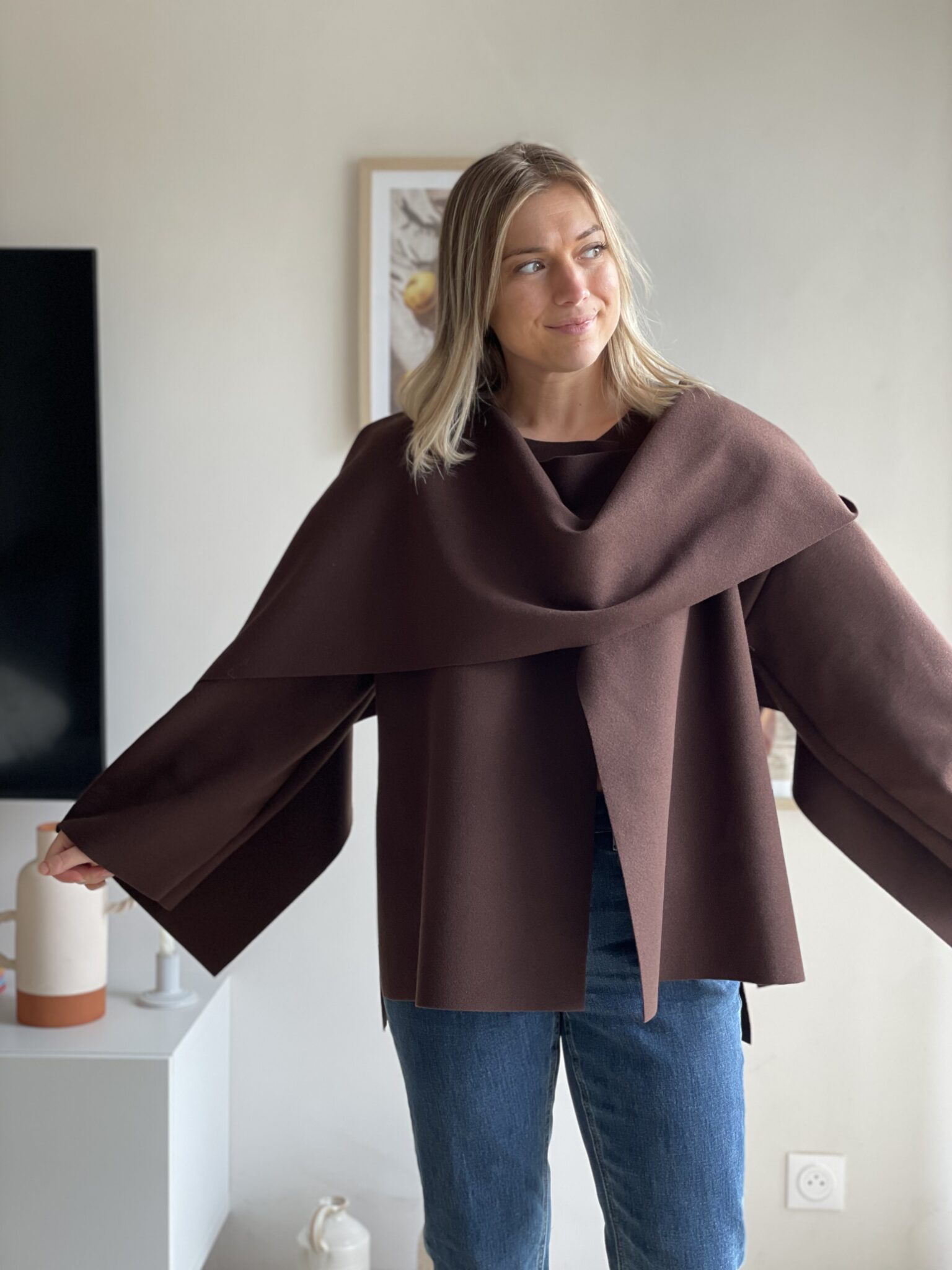 Coupe oversize Effet écharpe Manches chauve-souris Plus long dans le dos Bouton sur le col Oceane mesure 1m63 et porte habituellement une taille S 95% Polyester/ 5% Elasthanne Lavage à froid conseillé