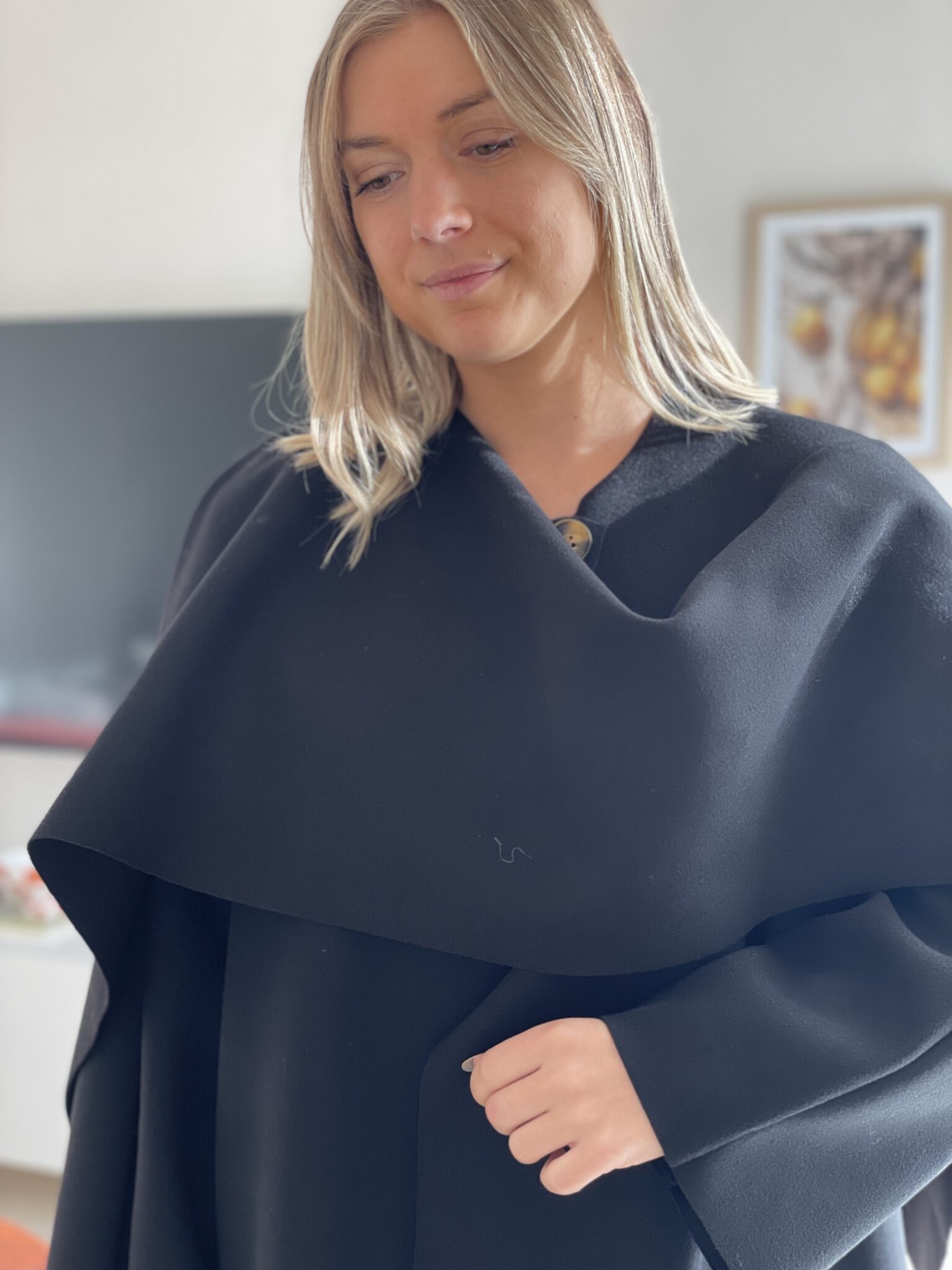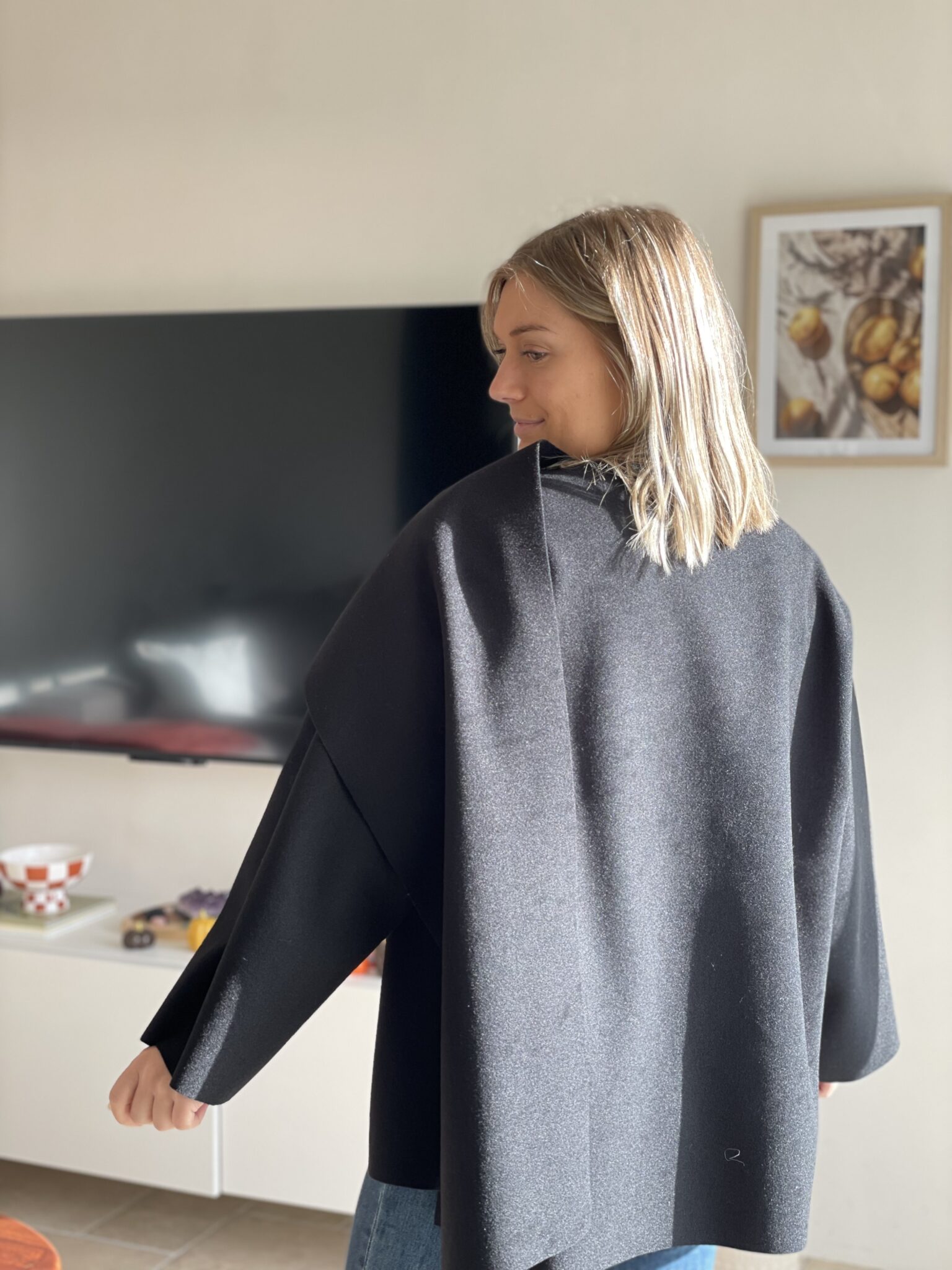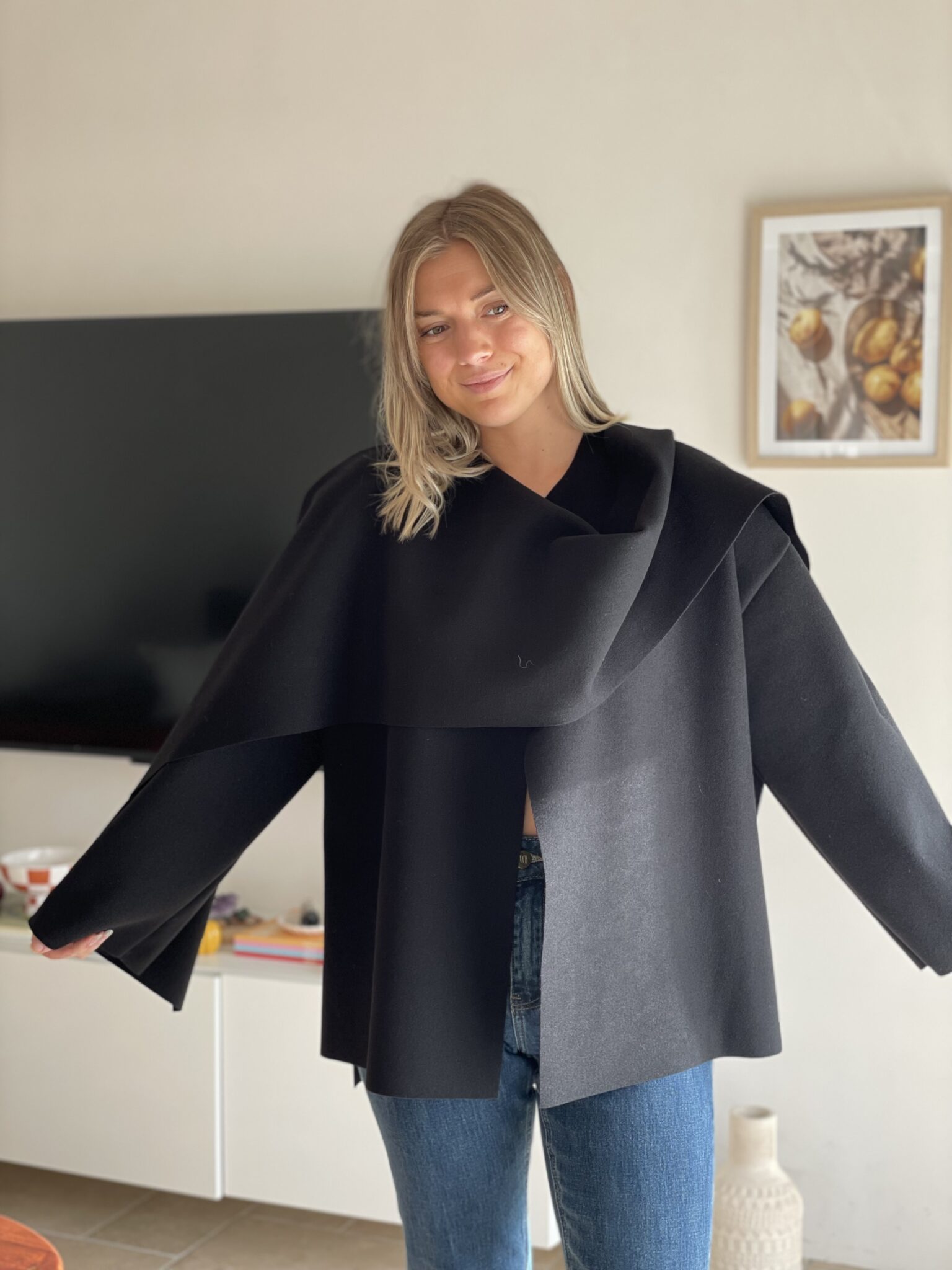 Coupe oversize Effet écharpe Manches chauve-souris Plus long dans le dos Bouton sur le col Oceane mesure 1m63 et porte habituellement une taille S 95% Polyester/ 5% Elasthanne Lavage à froid conseillé