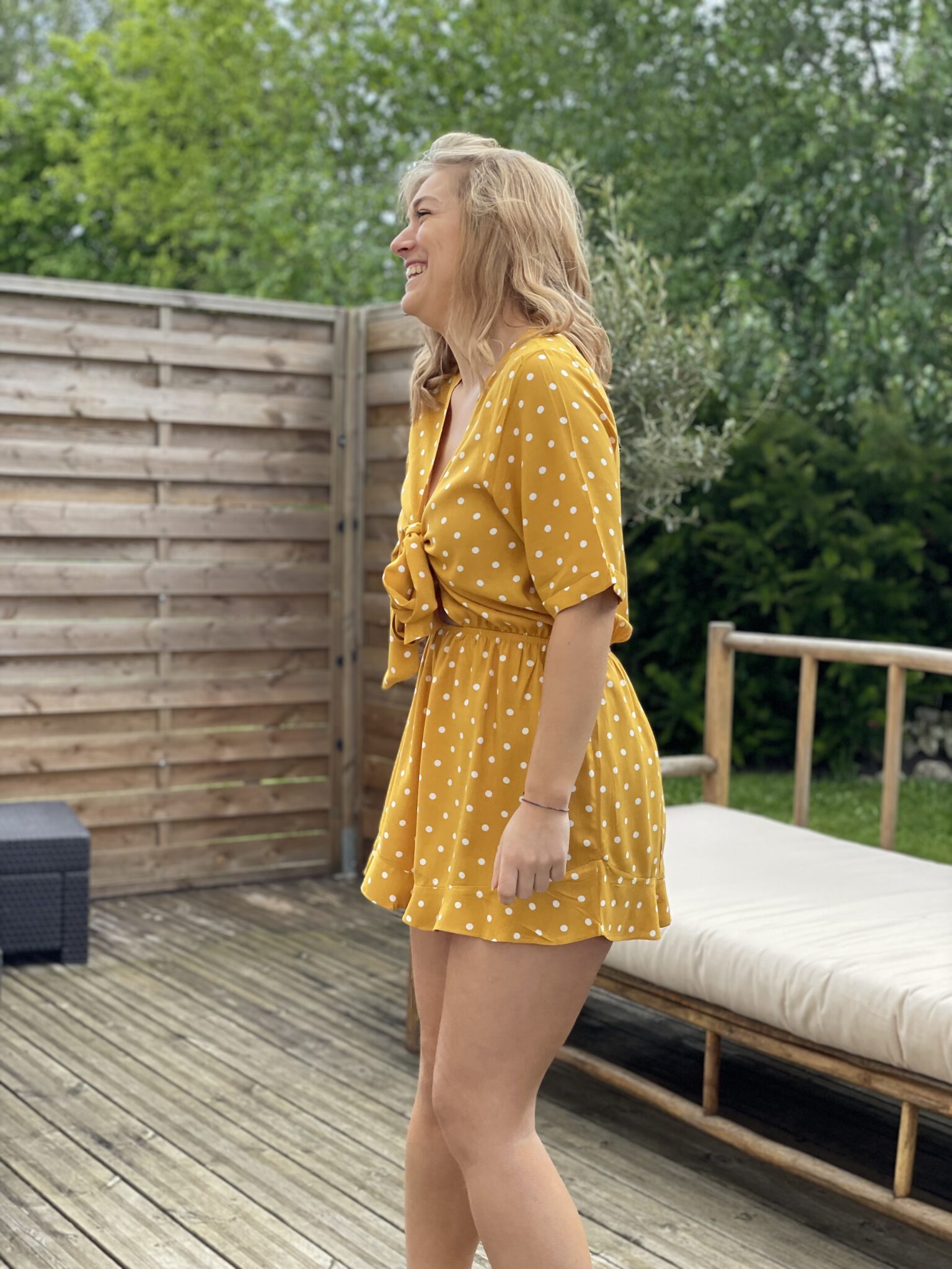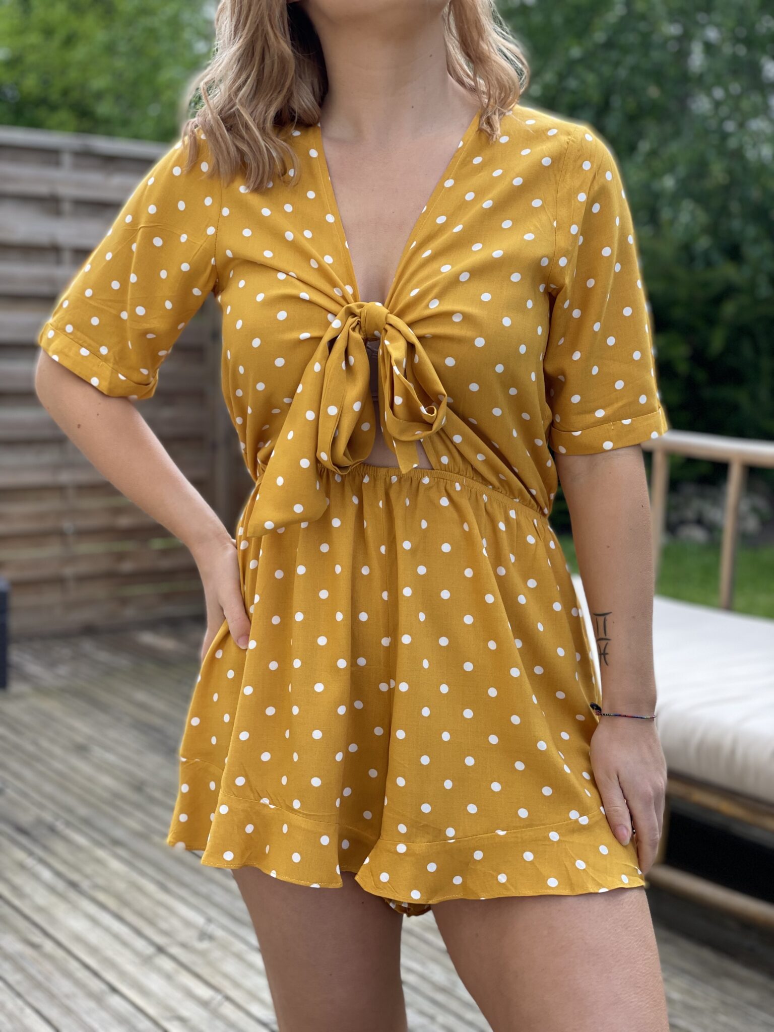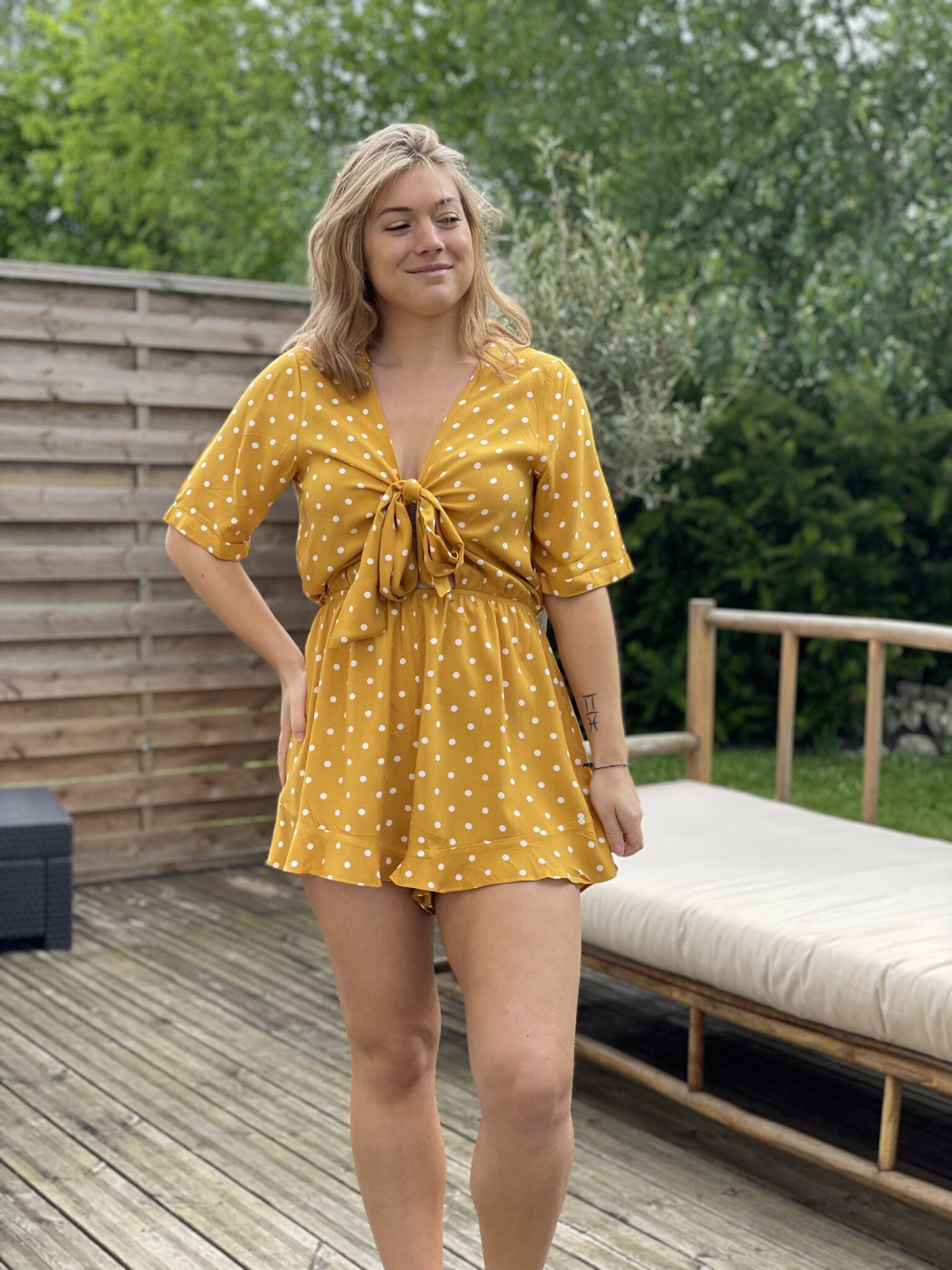 Col V Liens à nouer sur la poitrine Elastique à la taille Pois blanc sur fond jaune Manches courtes Oceane mesure 1m63 et porte une taille SM 100% Rayon Lavage à la main conseillé