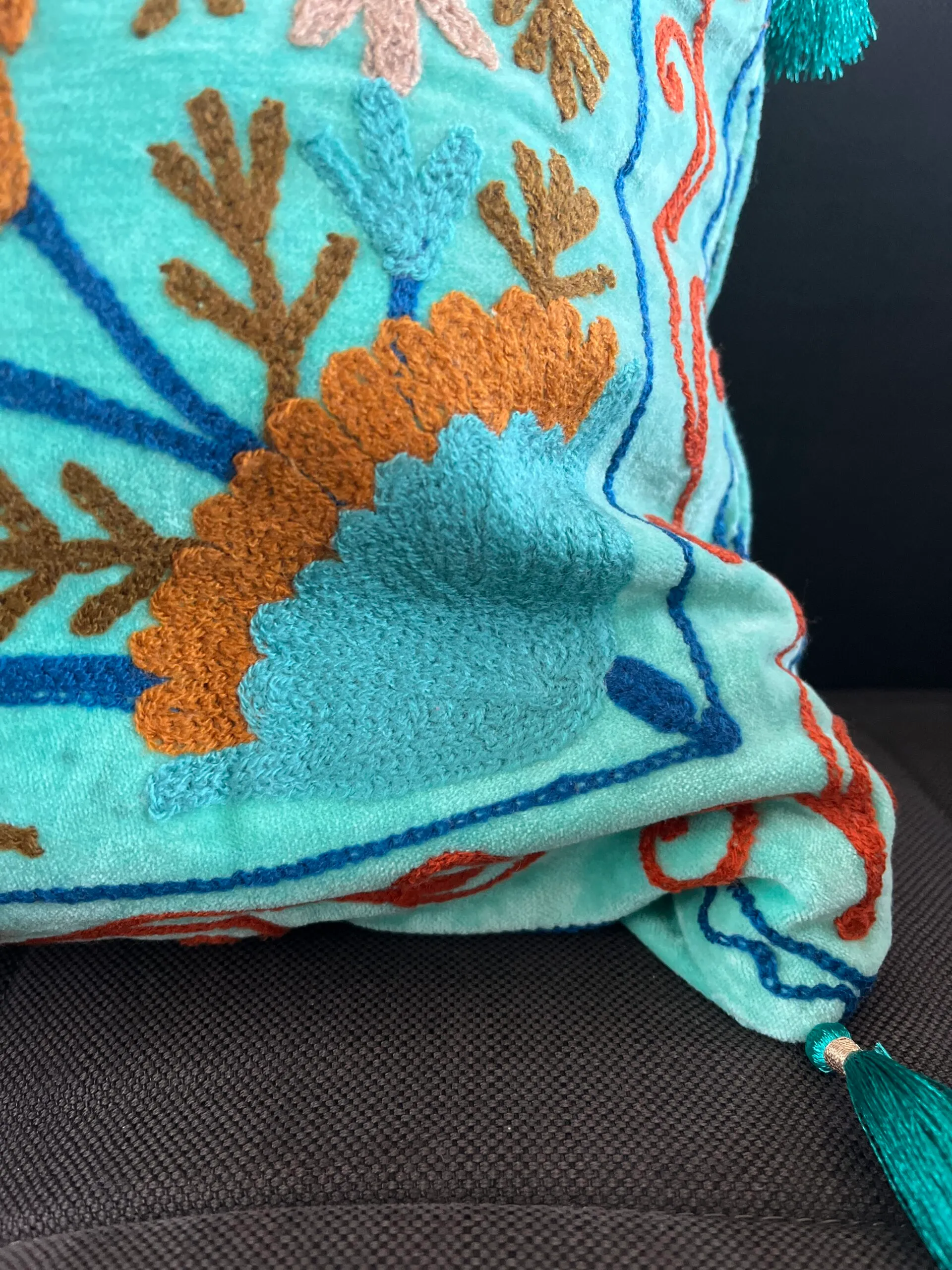 Housse de coussin 40×60 en velours brodé. Fabrication artisanale en Inde, broderie en laine. Déhoussable. Pièce unique et colorée pour sublimer ton intérieur. 100% fait main en Inde
