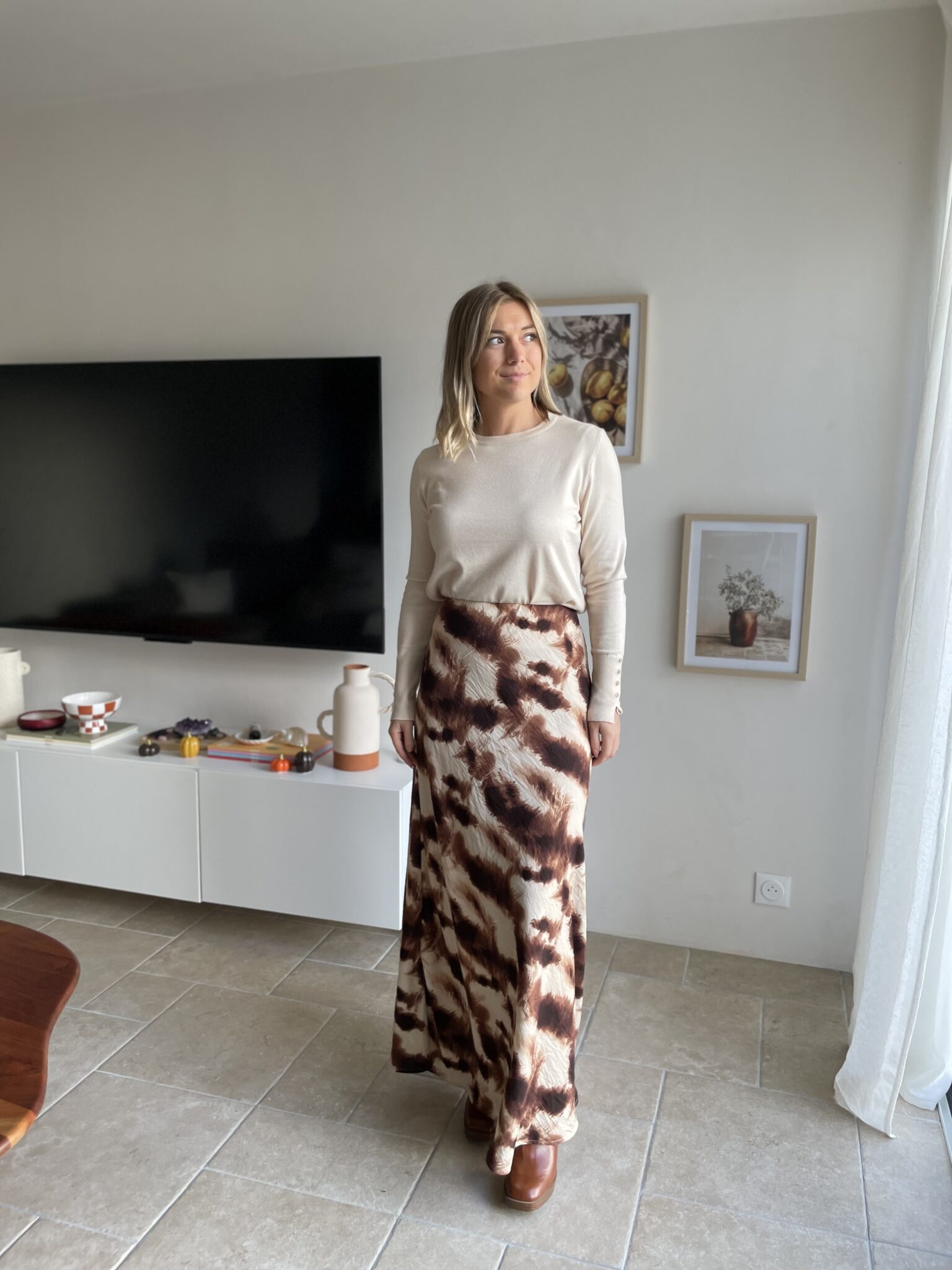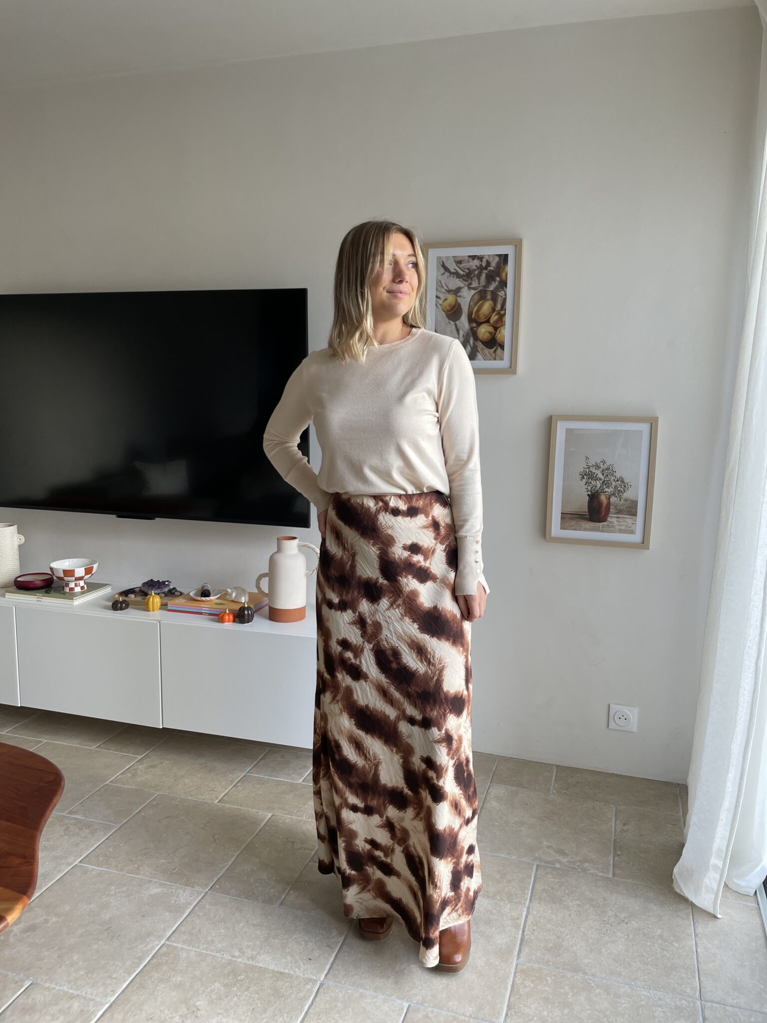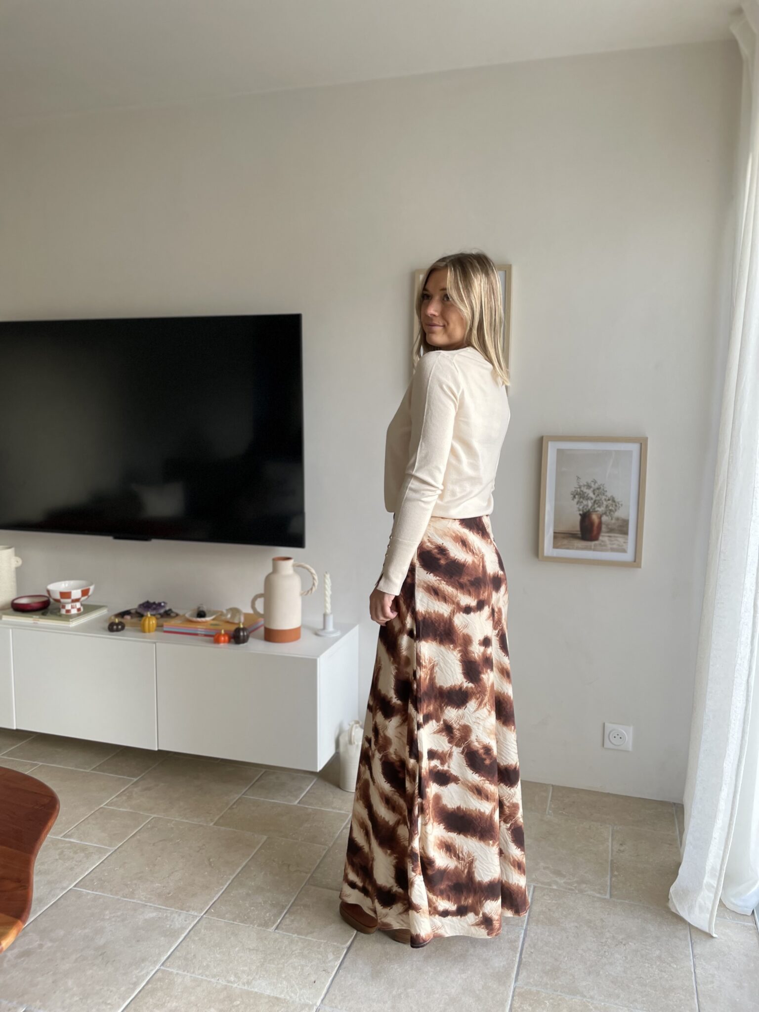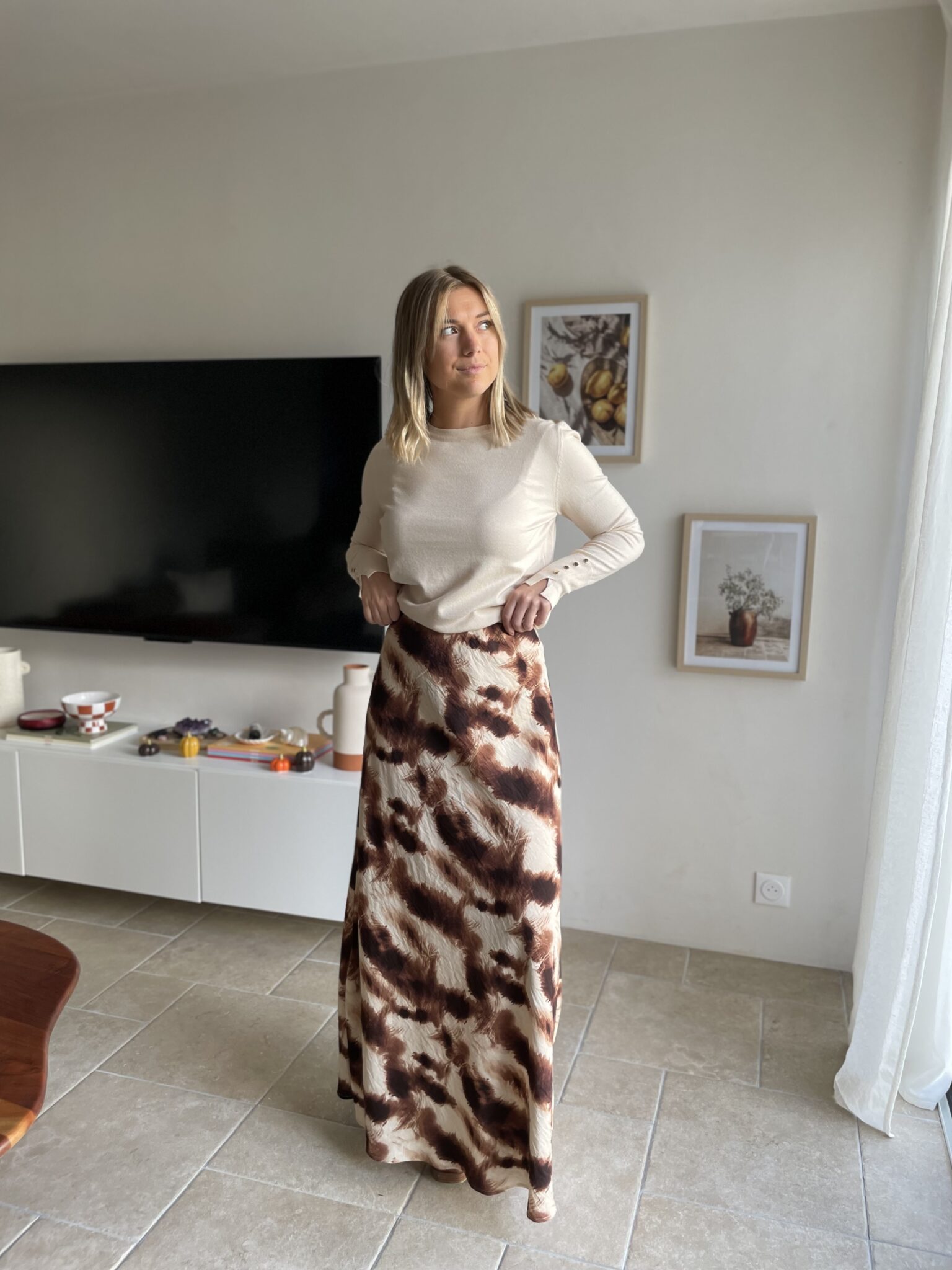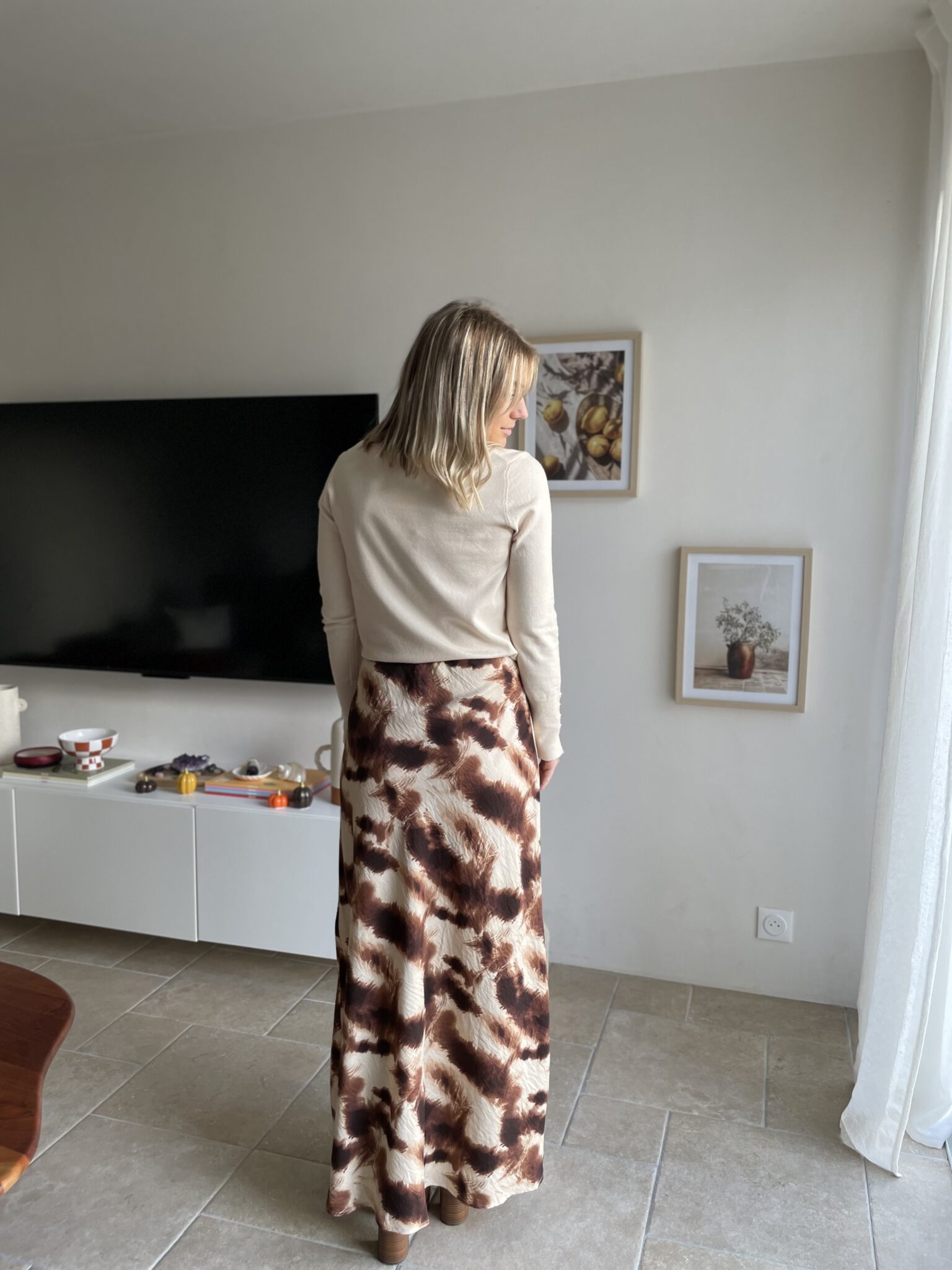Matière satinée Coupe droite Modèle long Elastique à la taille Oceane mesure 1m63 et porte une taille SM 80% Viscose/ 20% Polyamide Lavage à froid conseillé