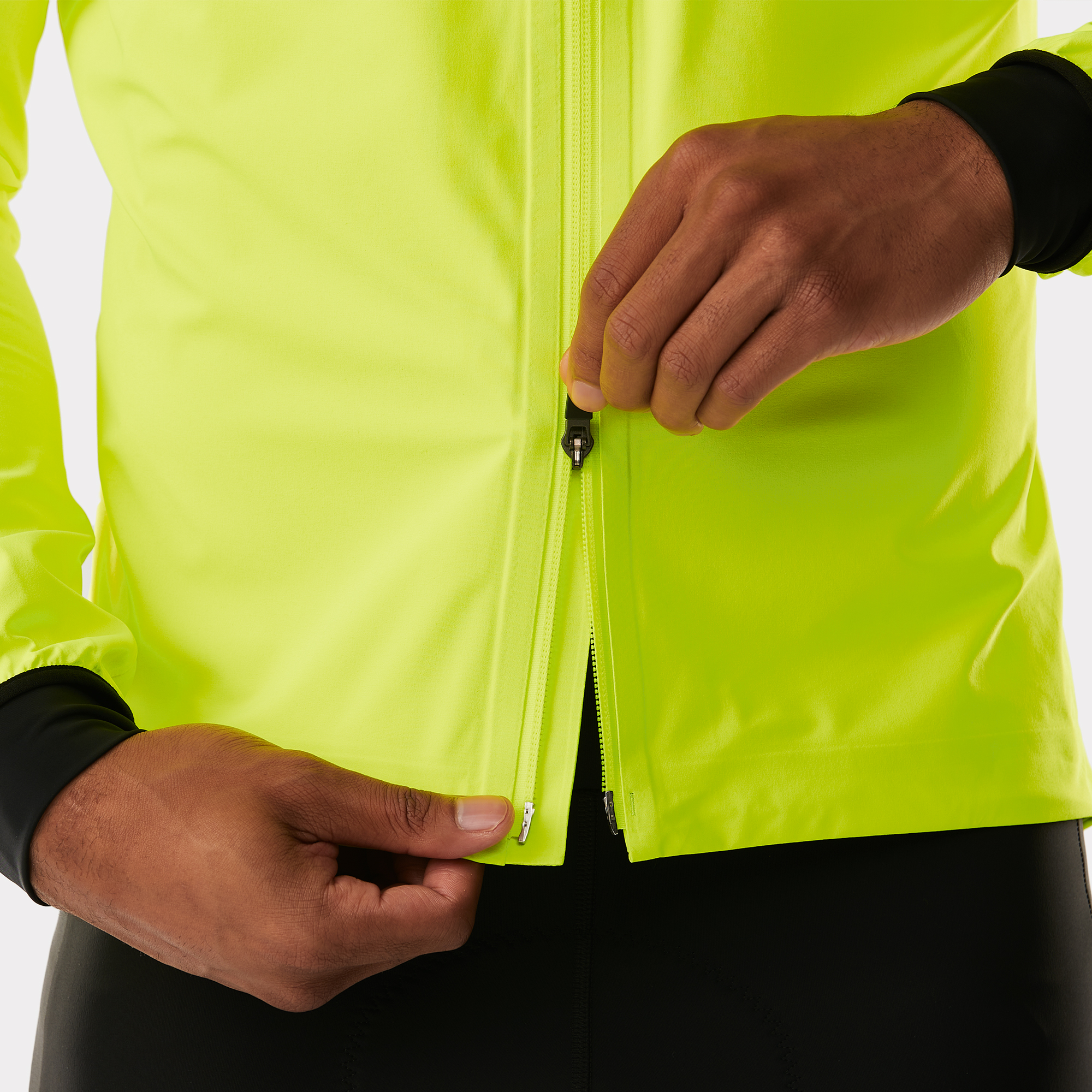 Une météo capricieuse ? Munissez-vous de la veste de cycliste Circuit Rain. De conception ultra-légère, elle se range rapidement lorsque vous n’en avez plus besoin. Sa membrane imperméable unique lui confère une imperméabilité de 10 000 mm et une respirabilité de 10 000 g/mm2, de quoi bien vous protéger des éléments. Coutures bordées d’un biais avec fermeture éclair imperméable à double sens pour accéder aux poches du maillot sans ouvrir la fermeture entièrement, tout en se protégeant des infiltrations d’eau Une ceinture à cordon et des soufflets au poignets permettent d’ajuster la veste au plus près pour une meilleure protection encore et sans avoir à ouvrir entièrement la fermeture.