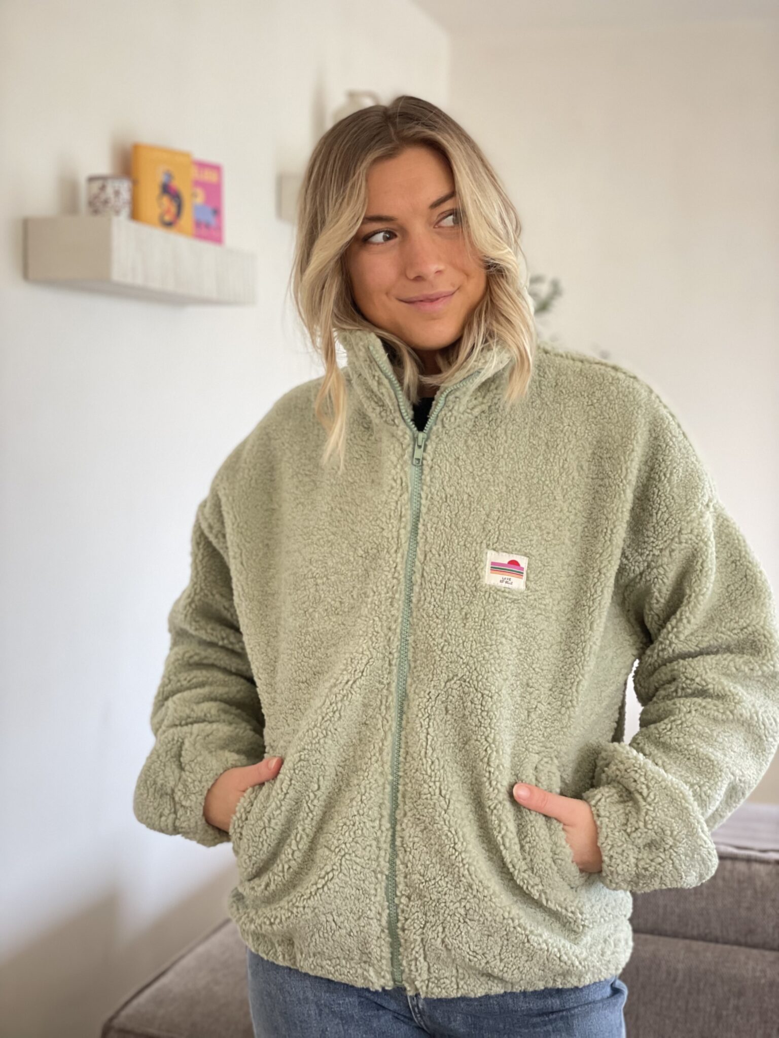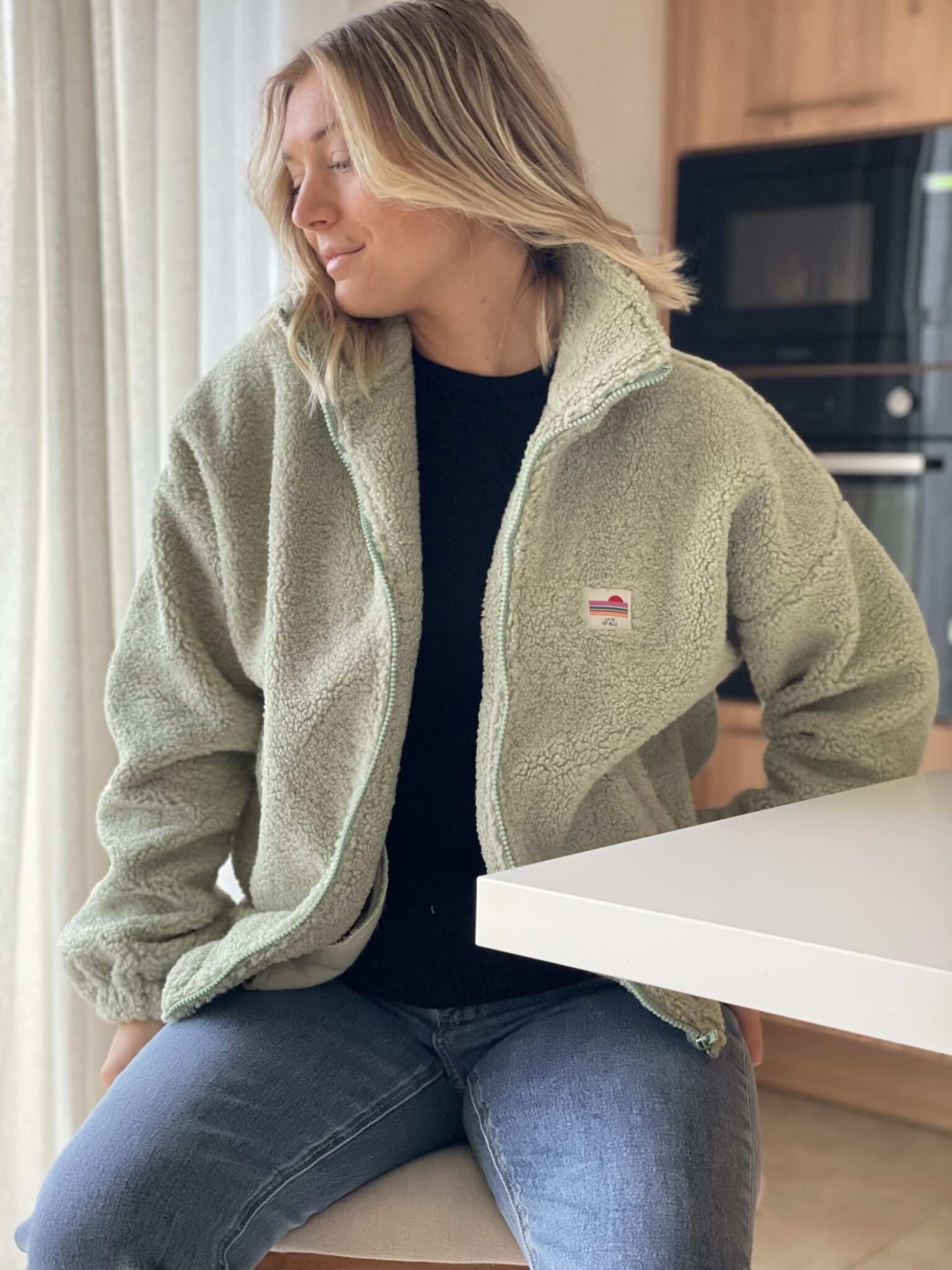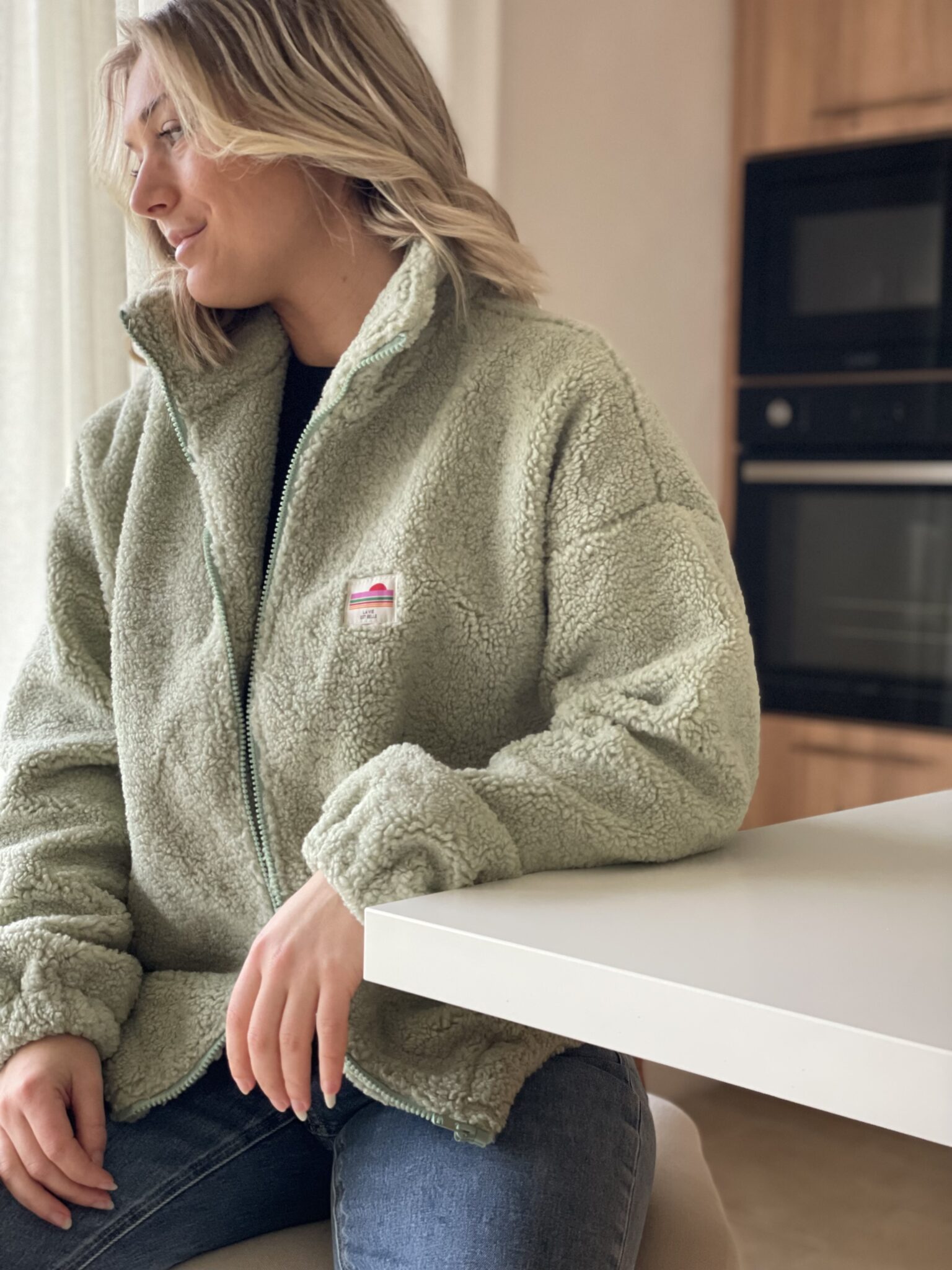 Matière bouclette Ecusson “La vie est belle” Fermeture zippée Resserrée dans le bas et sur les poignets Poches sur le devant Oceane mesure 1m63 et porte une taille SM 100% Polyester Lavage à froid conseillé