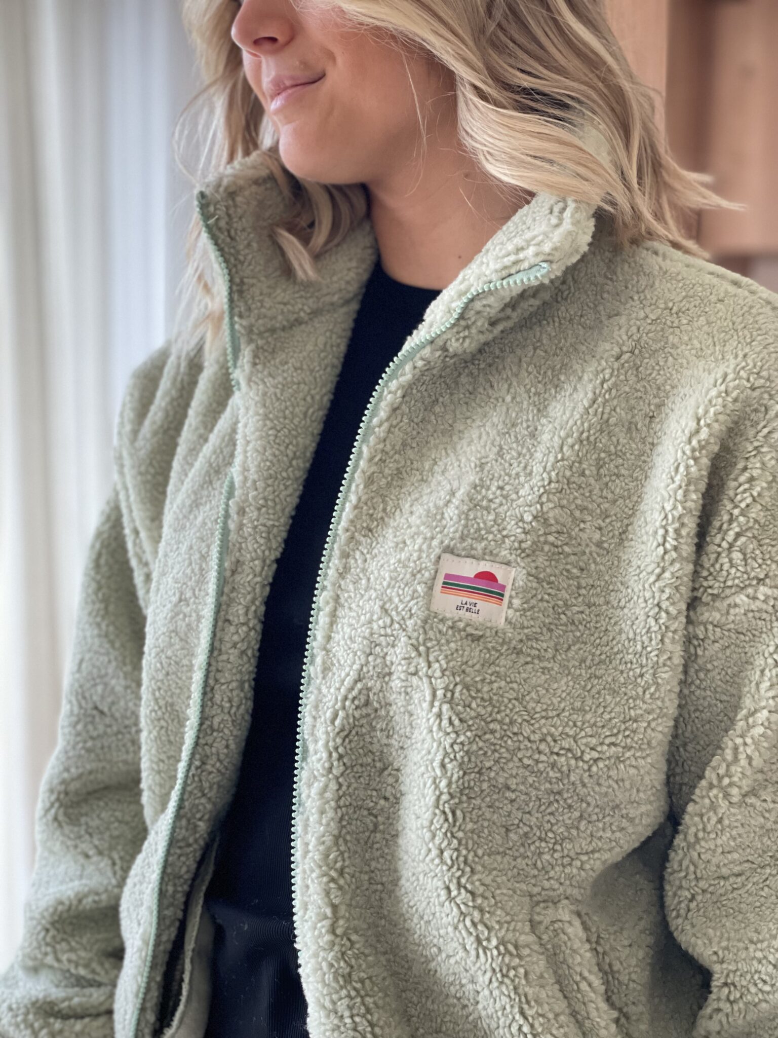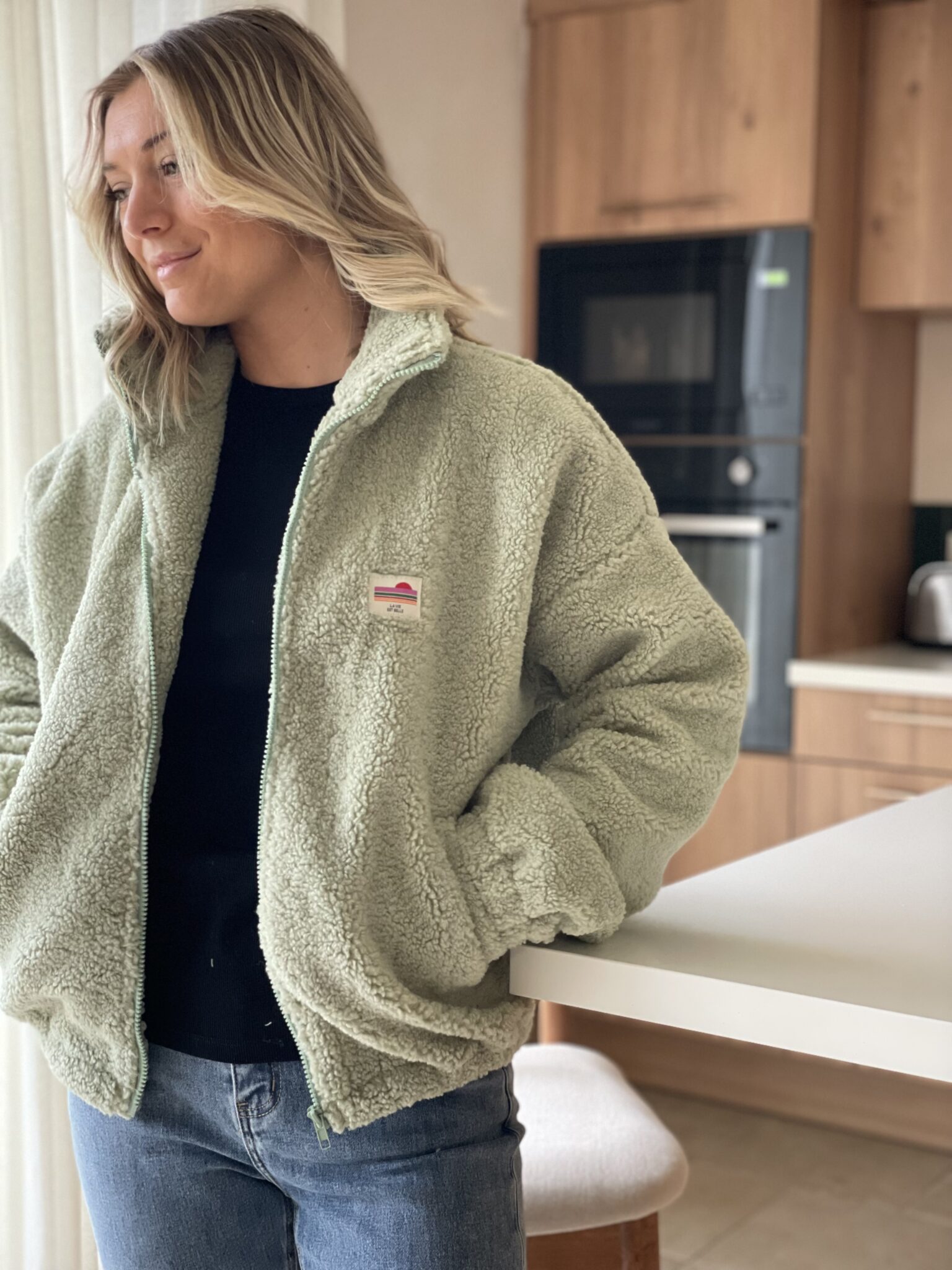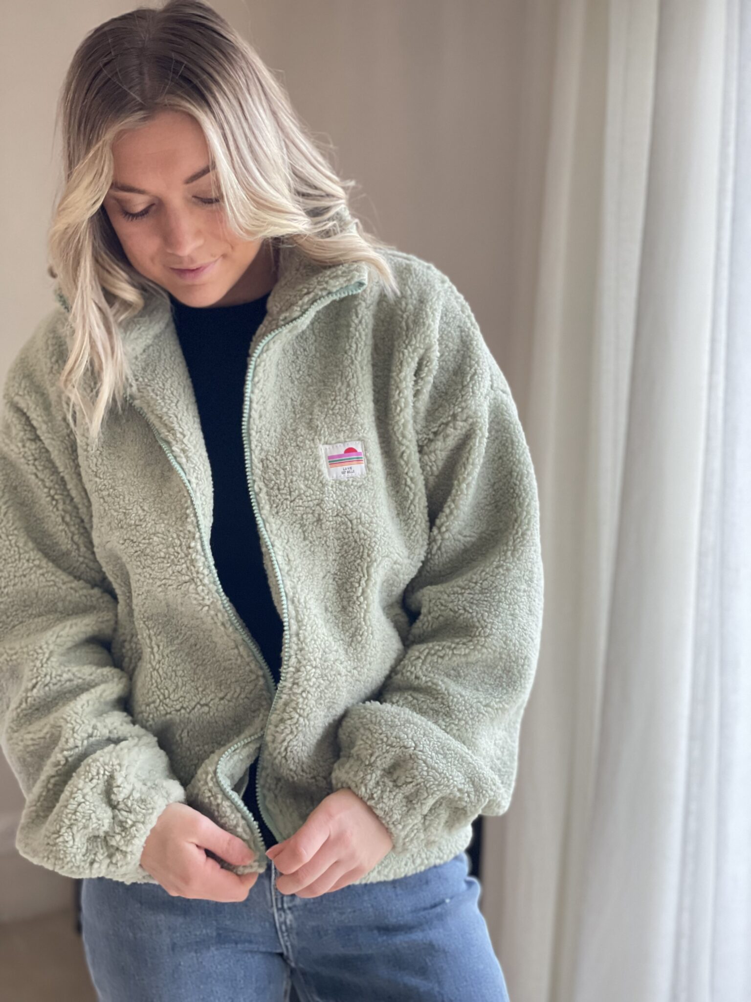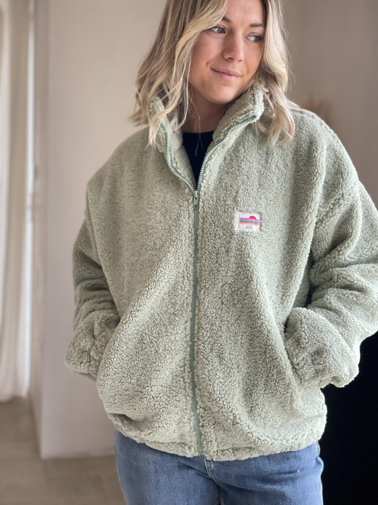 Matière bouclette Ecusson “La vie est belle” Fermeture zippée Resserrée dans le bas et sur les poignets Poches sur le devant Oceane mesure 1m63 et porte une taille SM 100% Polyester Lavage à froid conseillé