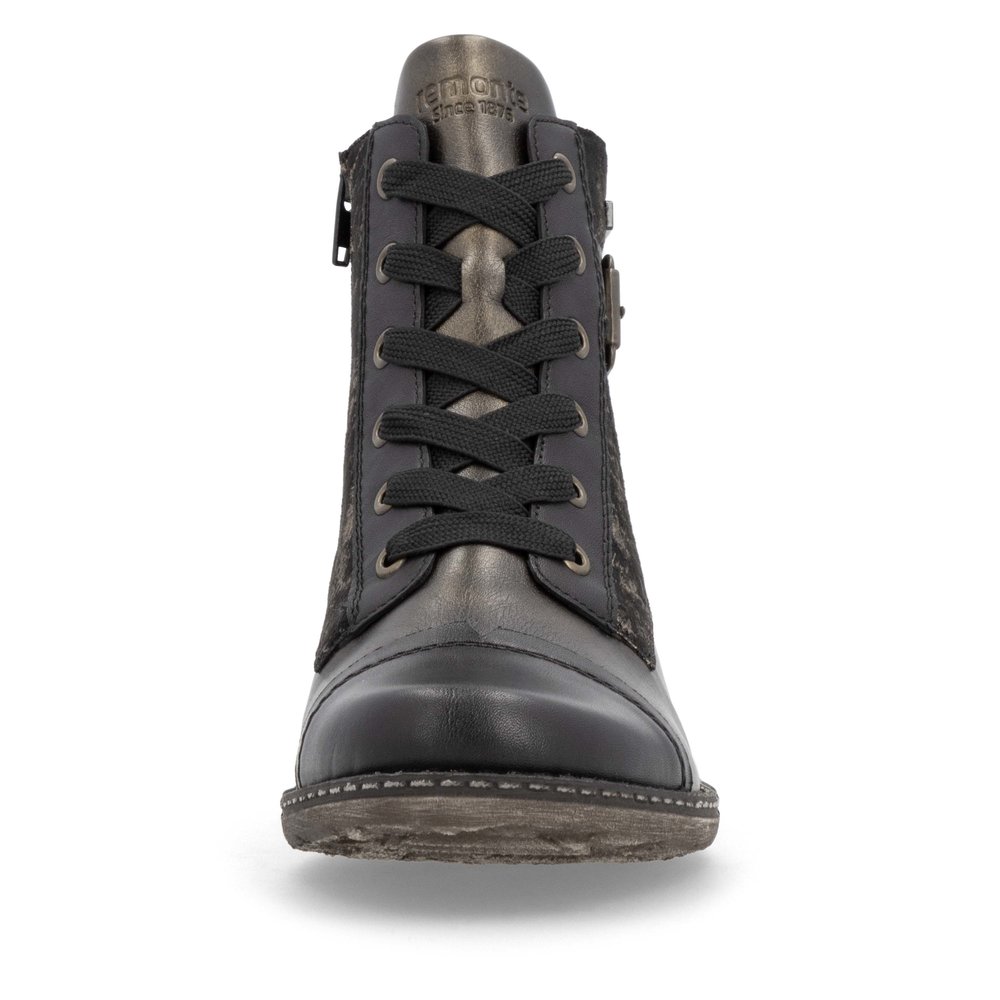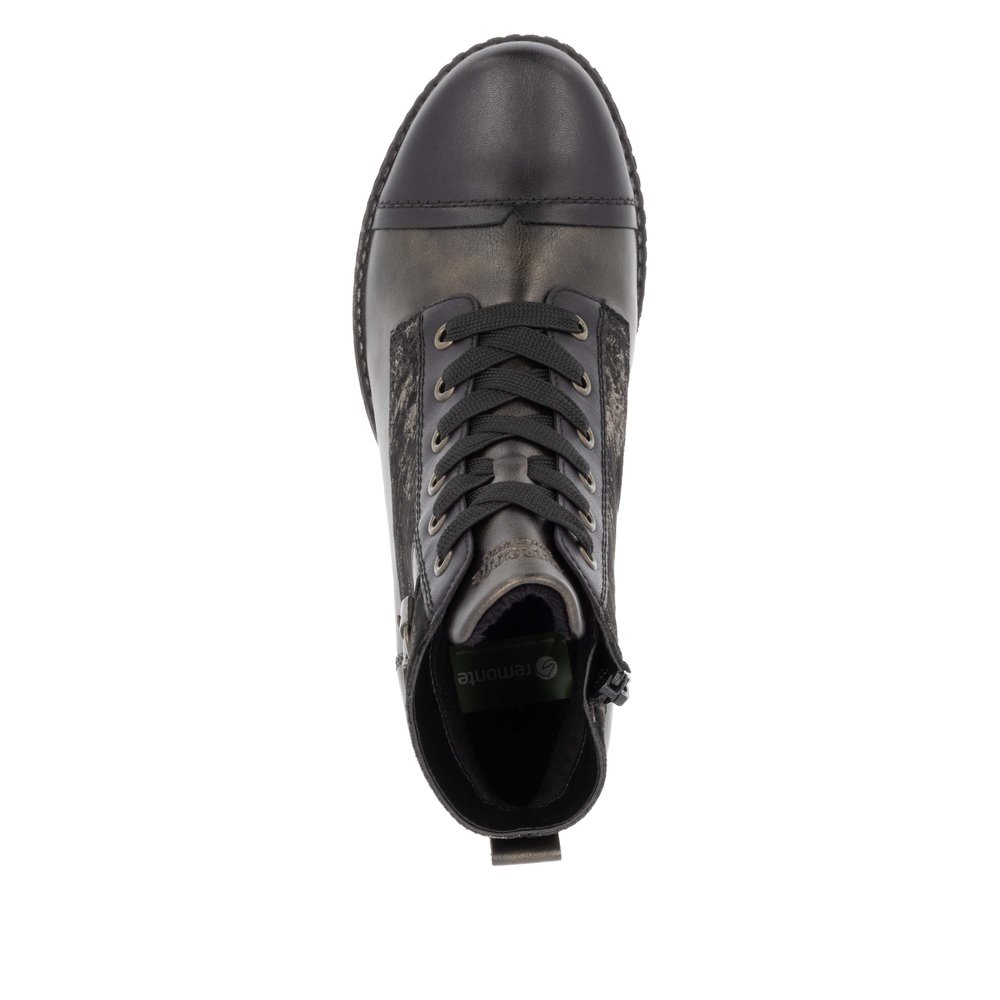 Botte courte pour femme Remonte. Doublure en mini velour pour couper l’humidité. Ajustable grâce aux lacets et enfilable rapidement grâce au fermoir éclair latéral. Semelle intérieur amovible pour insérer votre semelle orthopédique si besoin