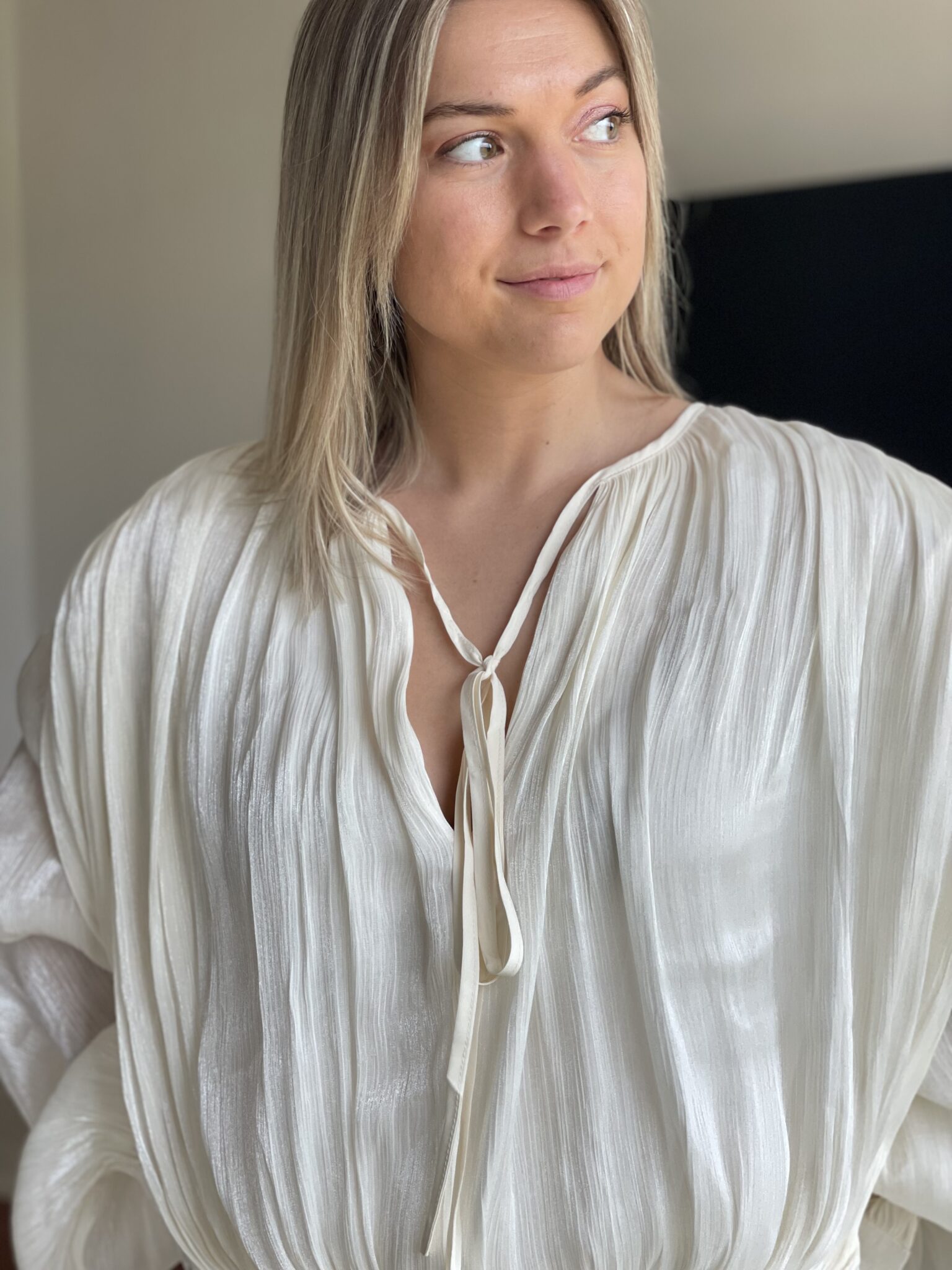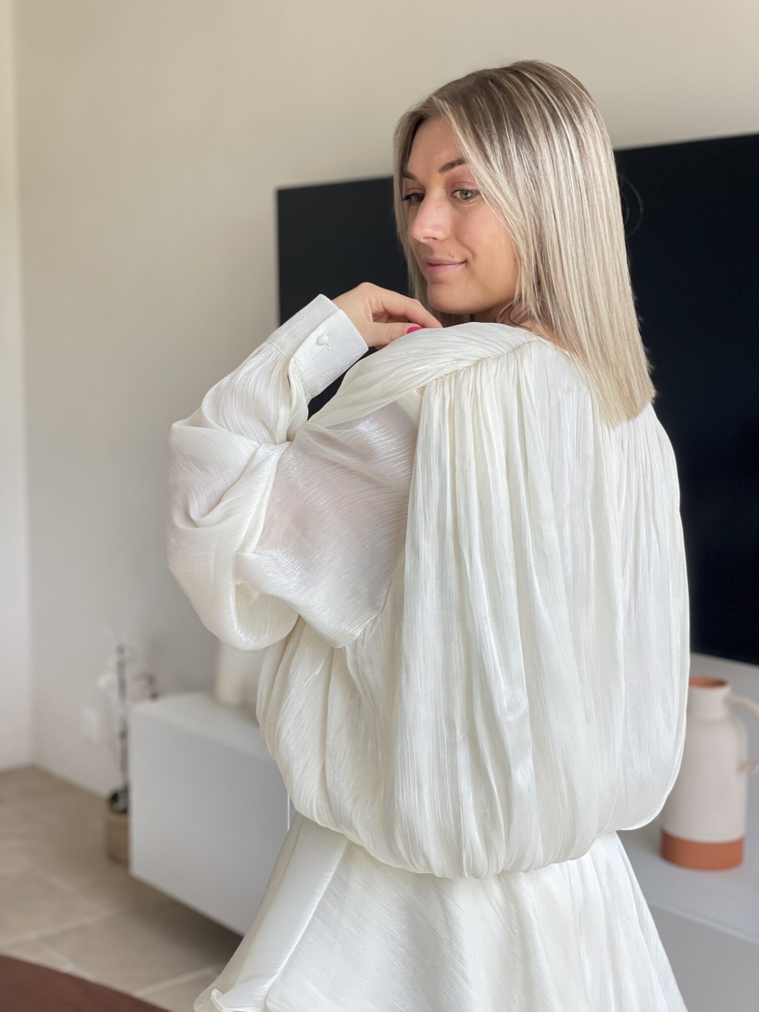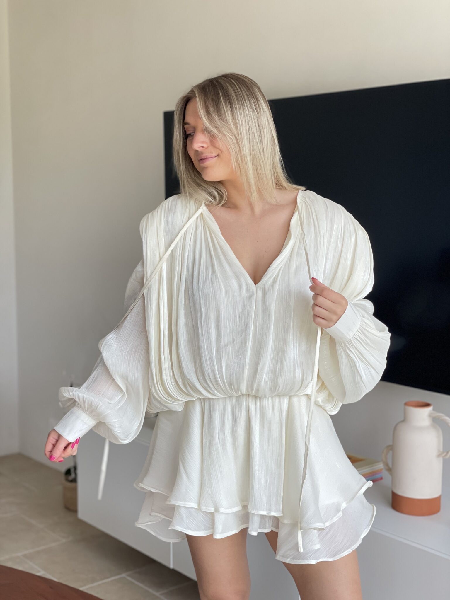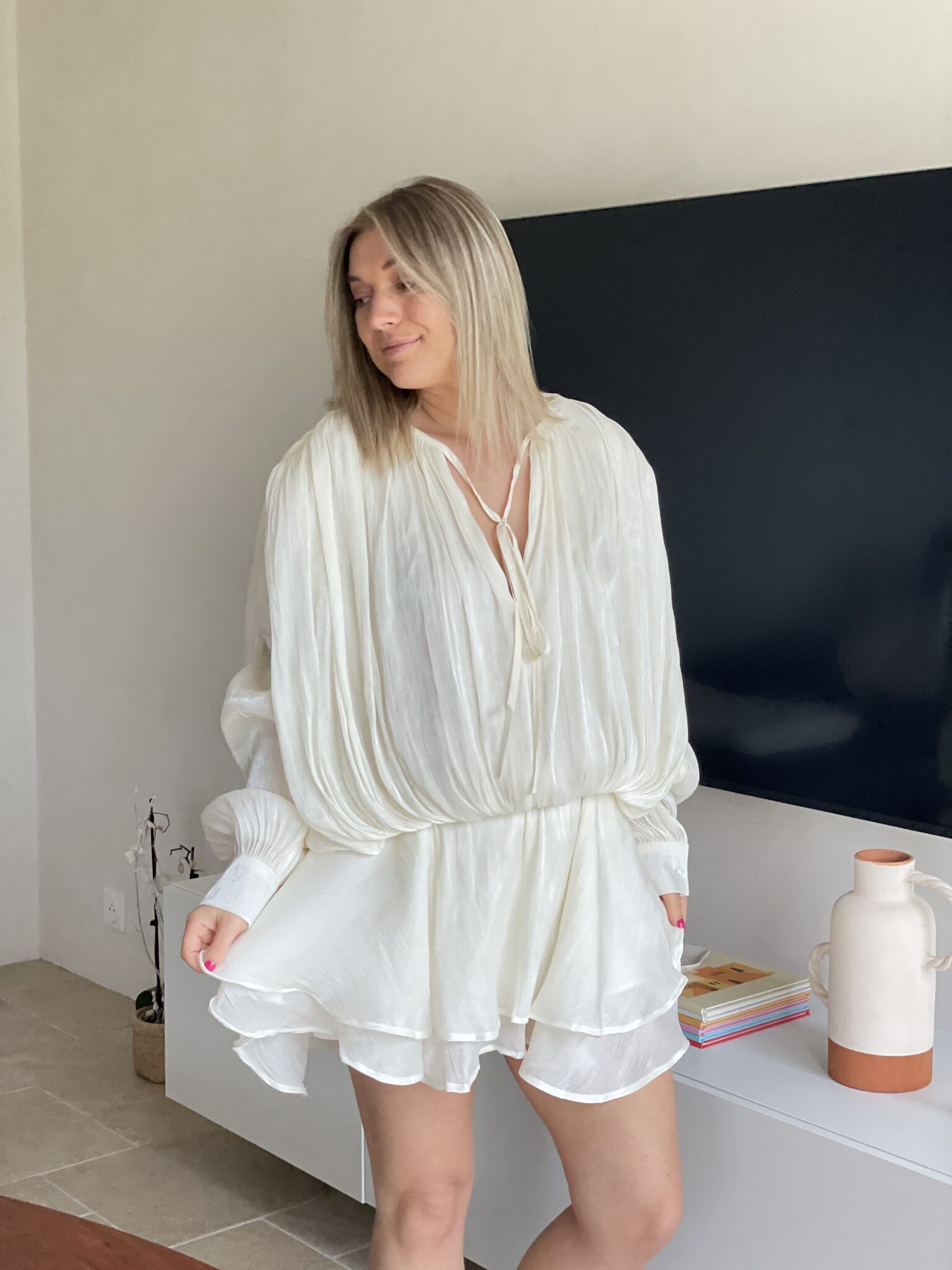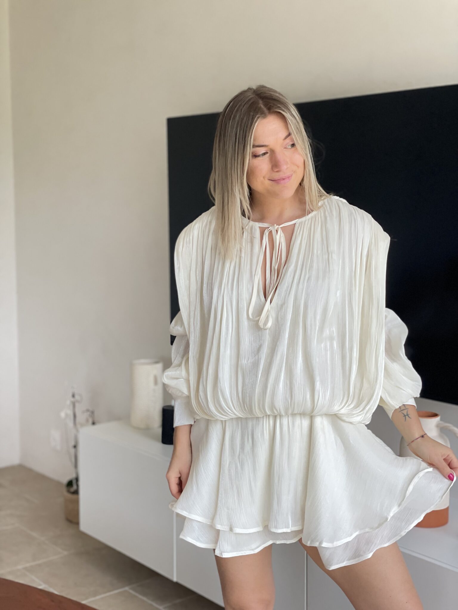 Matière satinée Coupe ample Doublure short Epaulettes Elastique à la taille Volants dans le bas Froncés aux épaules Fendue dans le dos Lien sur le col Oceane mesure 1m63 et porte habituellement une taille S 100% Polyamide Lavage à froid conseillé ( sur l’envers)