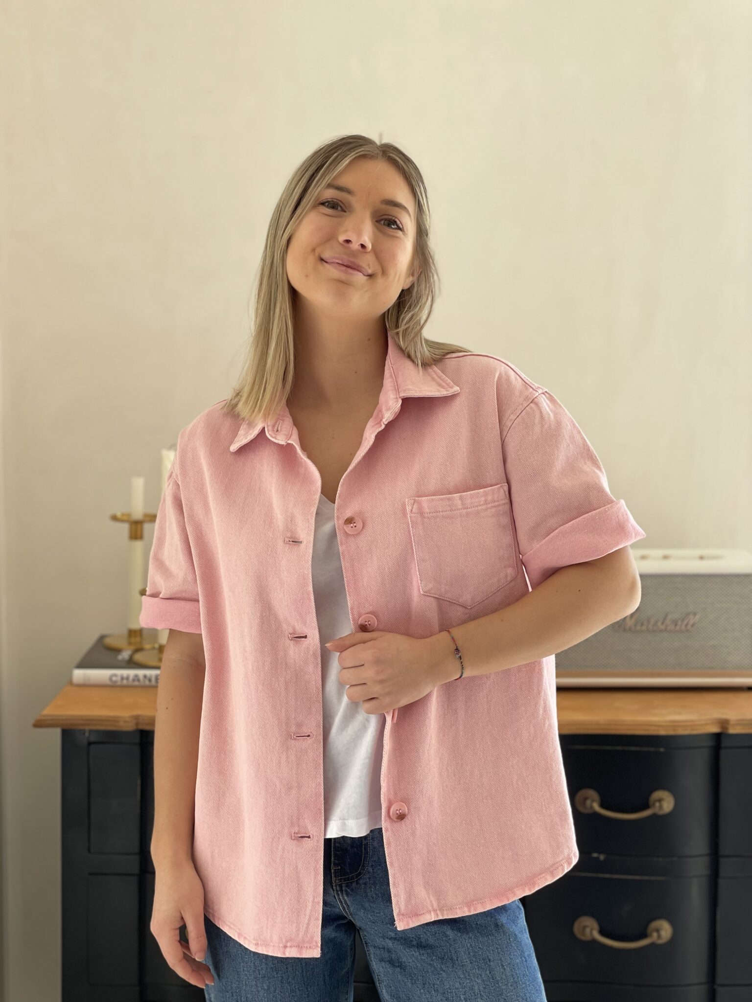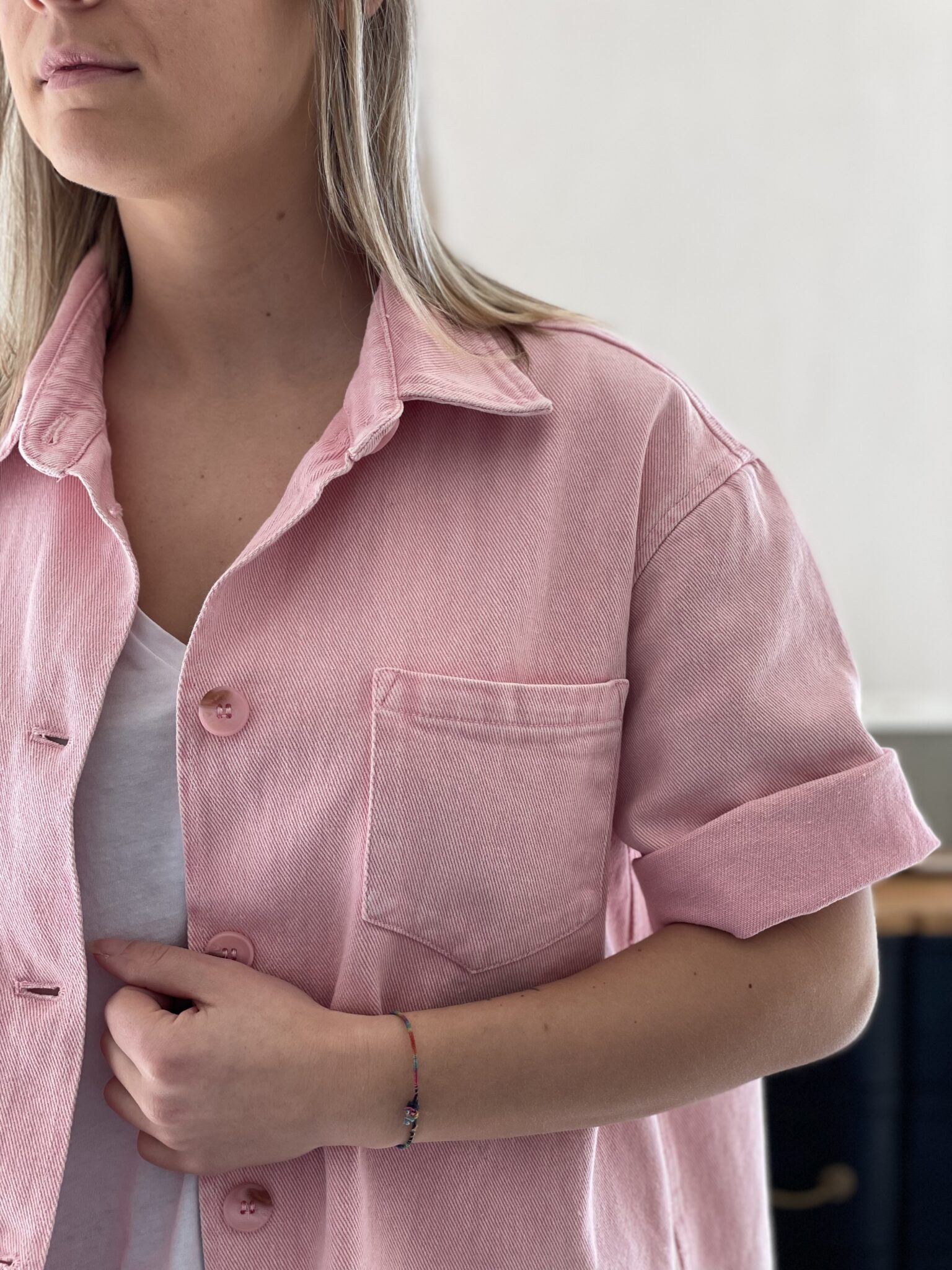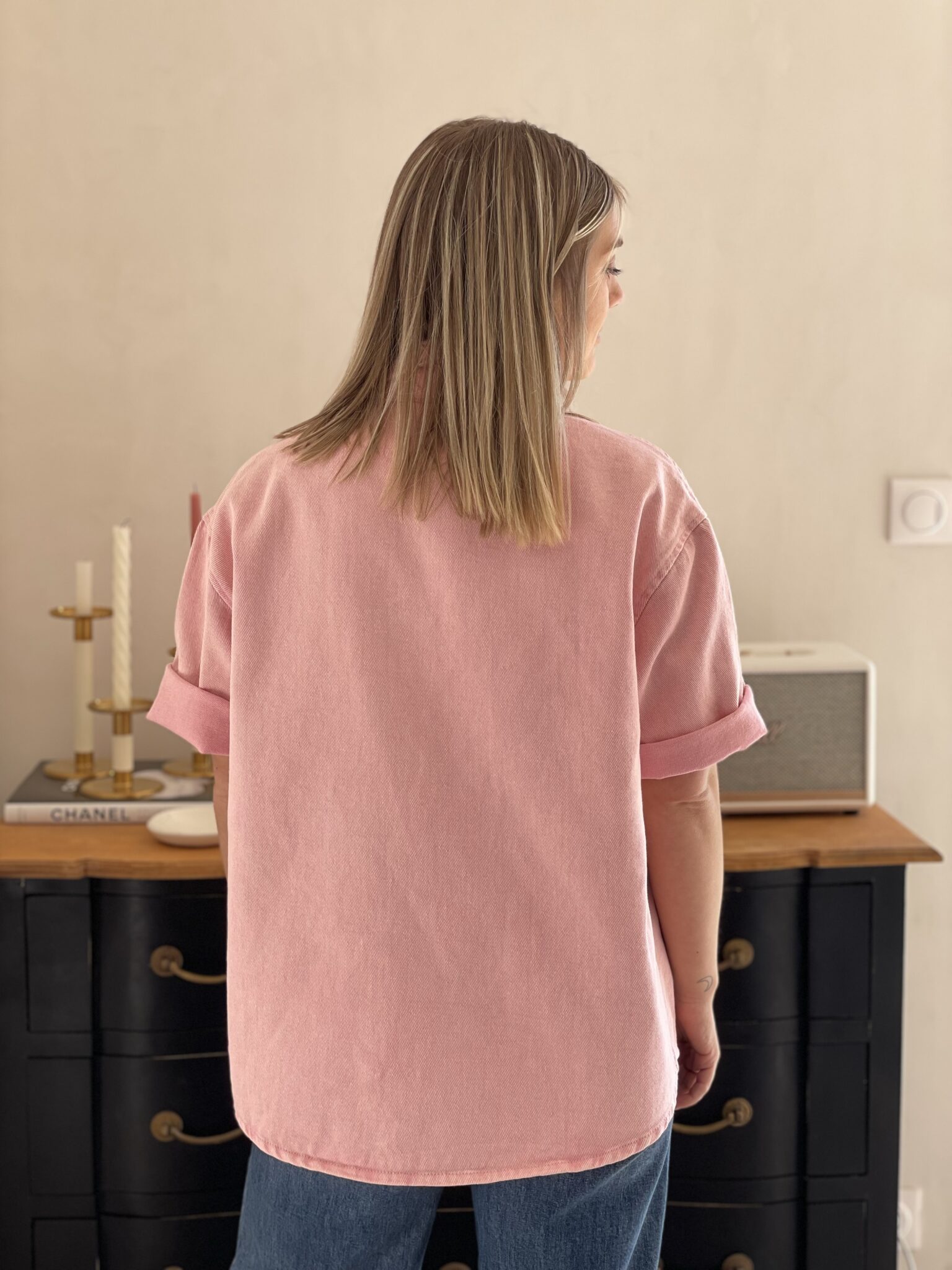 Coupe ample Matière jean Boutonnage sur le devant Poche sur la poitrine Demi manche Oceane mesure 1m63 et porte une taille S 100% Coton Lavage à froid conseillé