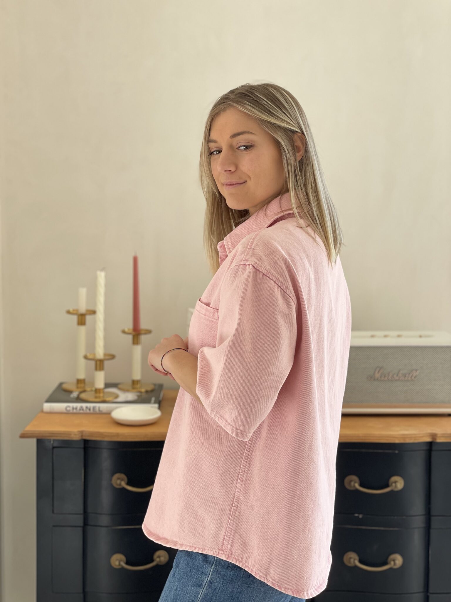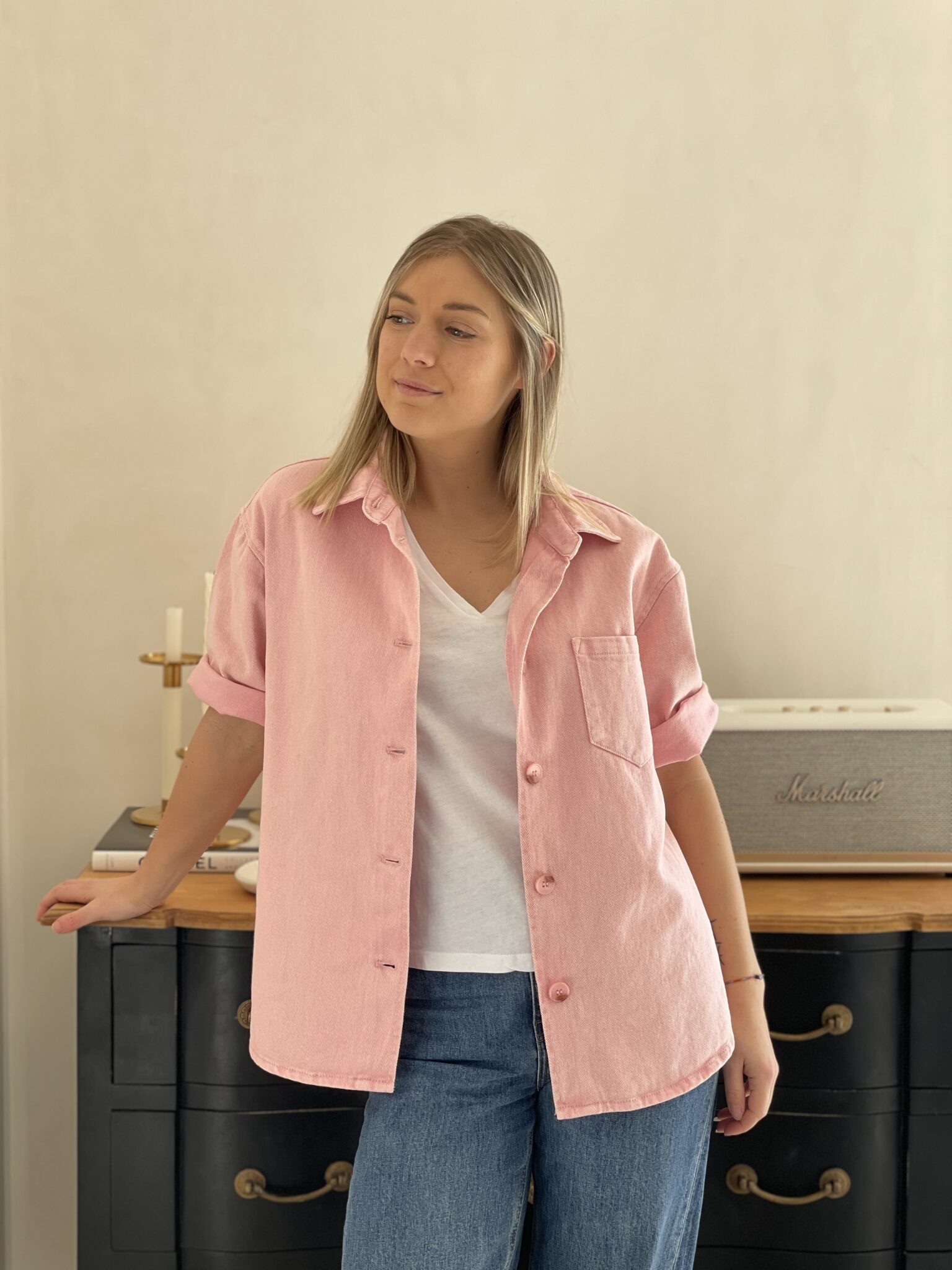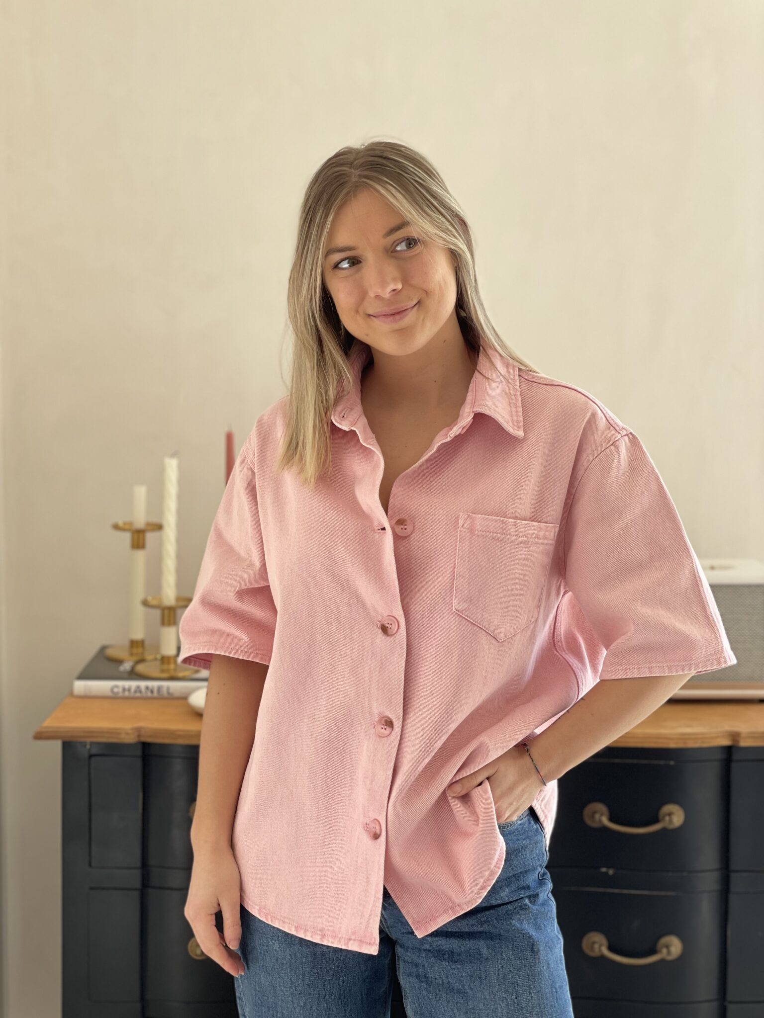 Coupe ample Matière jean Boutonnage sur le devant Poche sur la poitrine Demi manche Oceane mesure 1m63 et porte une taille S 100% Coton Lavage à froid conseillé