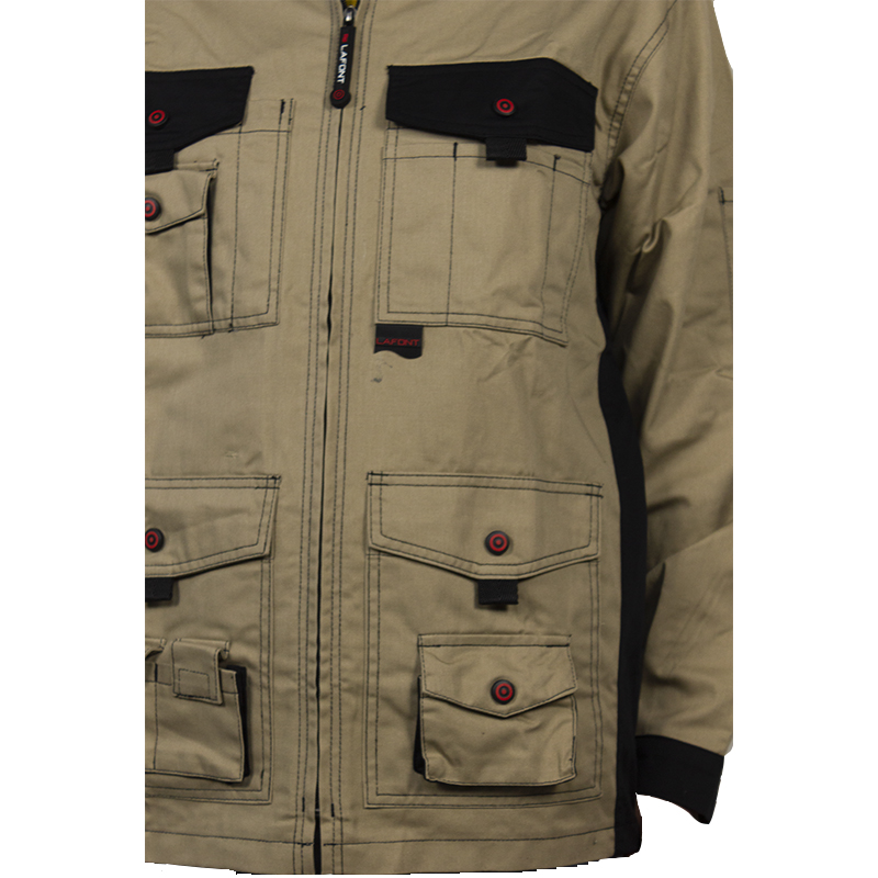 Veste de travail beige/noir T. 5 56/58 de LAFONT. 15 Poches et surpoches. Poignées réglables Ref. 2ATT00CP. Tissu 65% coton /35% polyester 250gr.